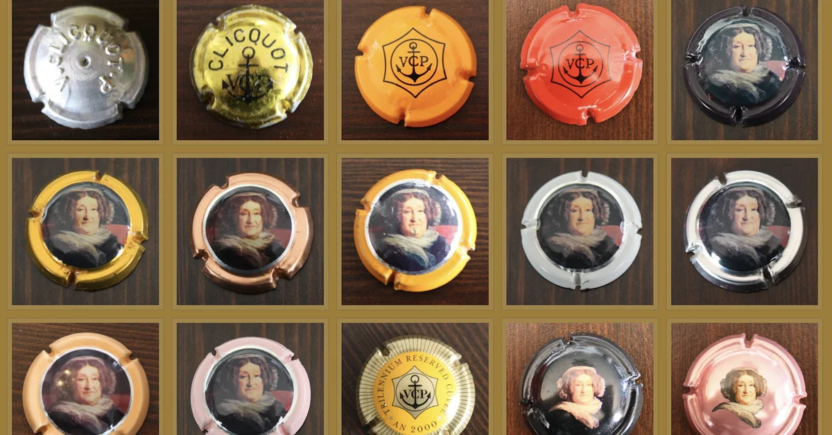 A selection of Veuve Clicquot champagne capsules, used with a wire cage to keep the cork of the wine in place. The face is Madame Barbe-Nicole Clicquot-Ponsardin (1777-1866), who designed the VCP and anchor logo.