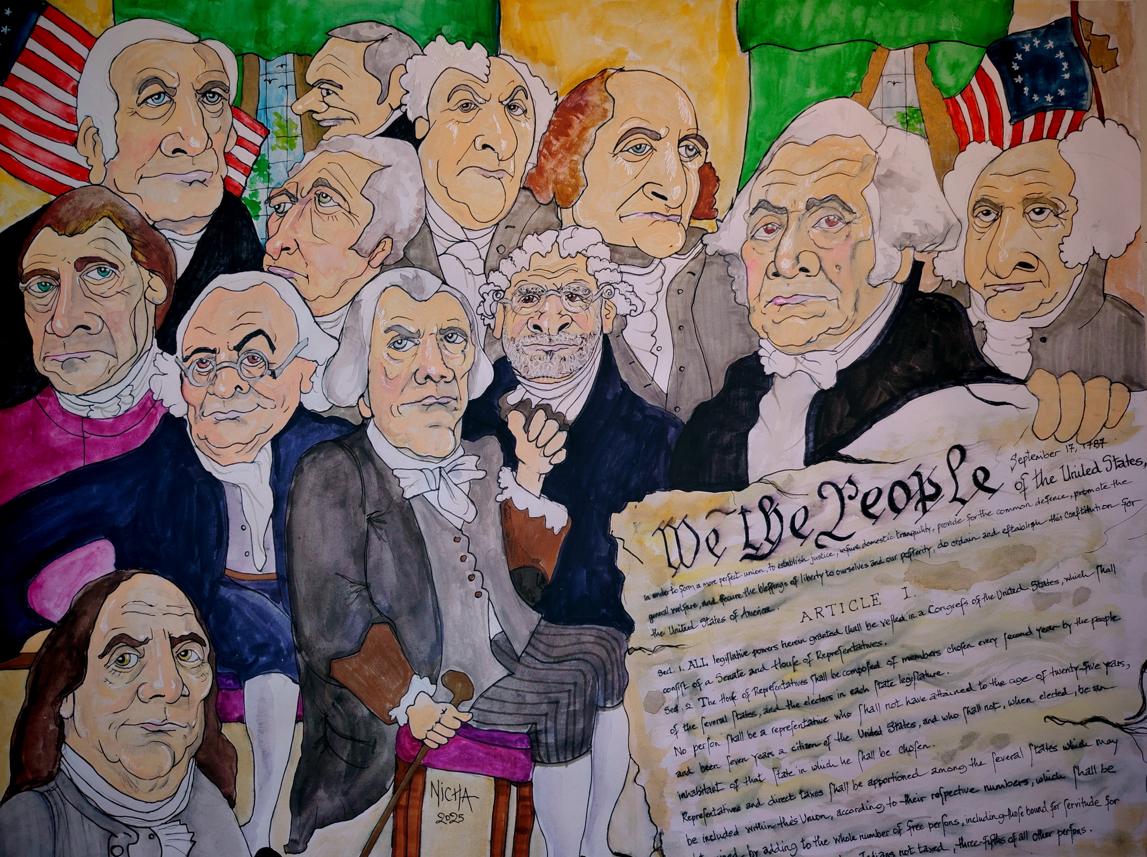 A gouache on paper painting titled The Constitution 1787 by Nicha Sursock. This is part of a series of 43 works representing the history of the USA.