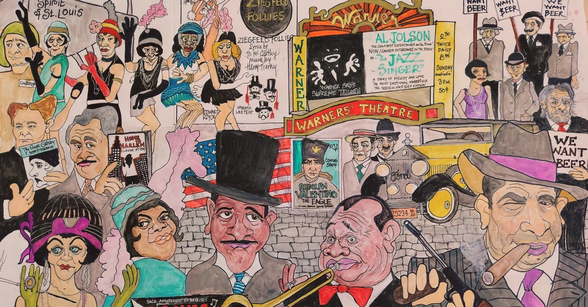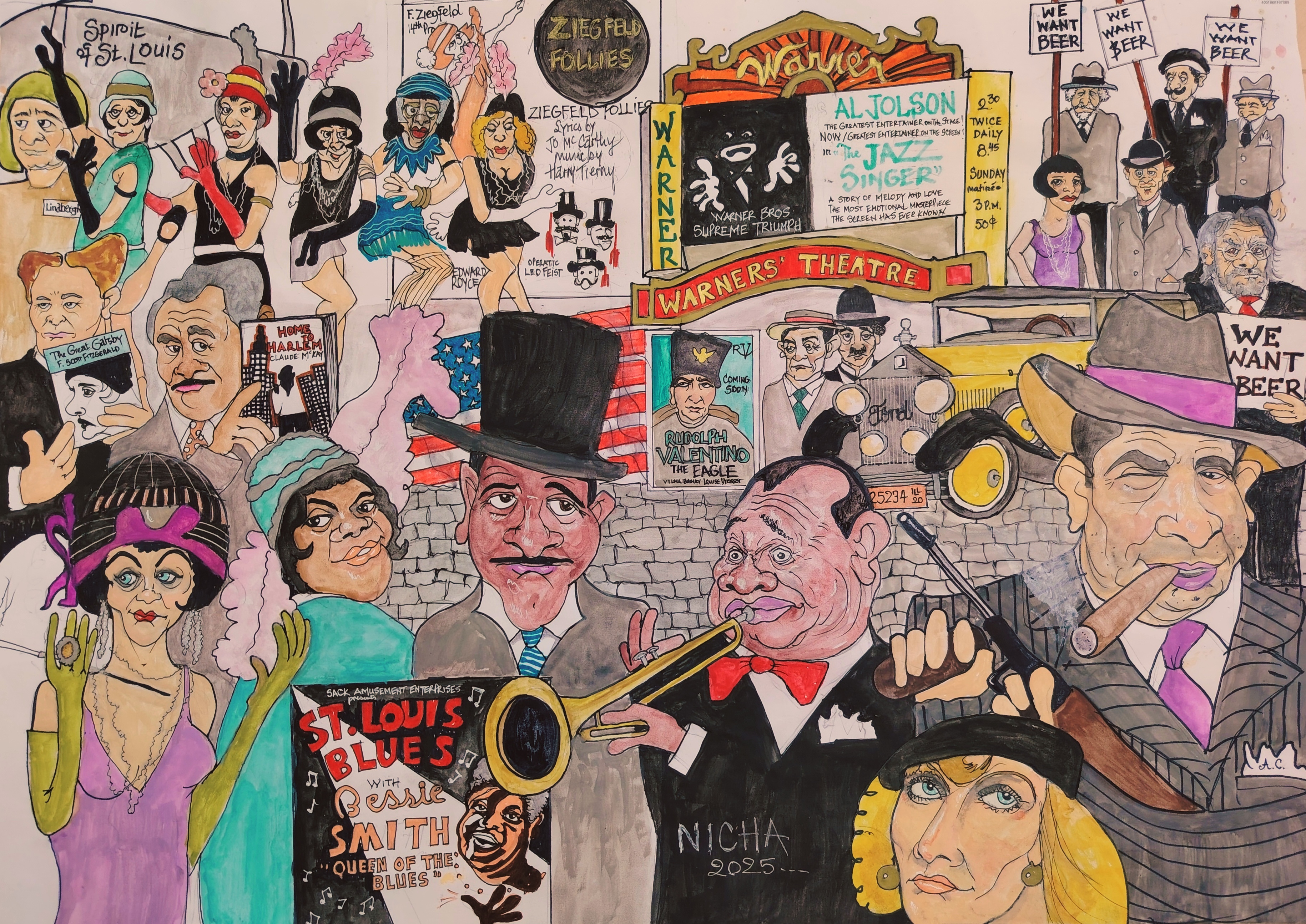Bringing together Jazz greats Louis Armstrong, Duke Ellington, Bessie Smith, entertainers Al Jolson, Charlie Chaplin, Buster Keaton, Rudolf Valentino, writers Scott Fitzgerald and Claude McCay beside Charles Lindbergh and Al Capone.