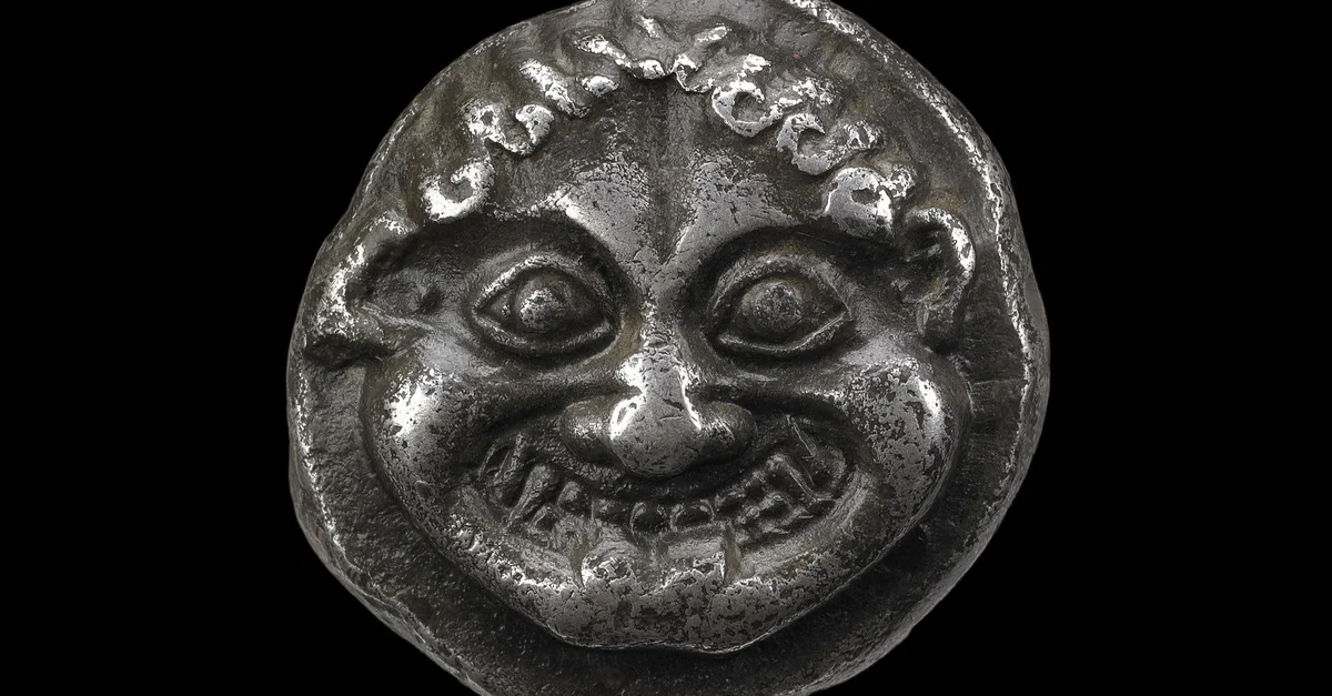 Minted in the ancient Greek city-state of Athens, this silver coin depicts a Gorgon's head, a symbolic ward against evil also known as a "gorgoneion." On the reverse, not pictured here, is stamped a square divided into four triangles.