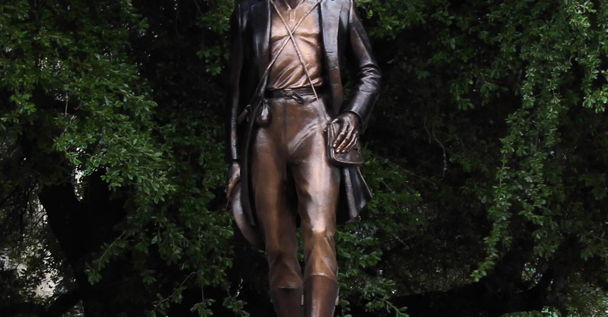Created by sculptor Allie Tenant in 1938, this statue, located in the eponymous city of Bonham, Texas, commemorates James Butler Bonham (1807-1836), who brought word on 3 March 1836 that reinforcements were en route to lift the siege at the Alamo. They never arrived. Three days later, Bonham was among the last to fall in the Battle of the Alamo.