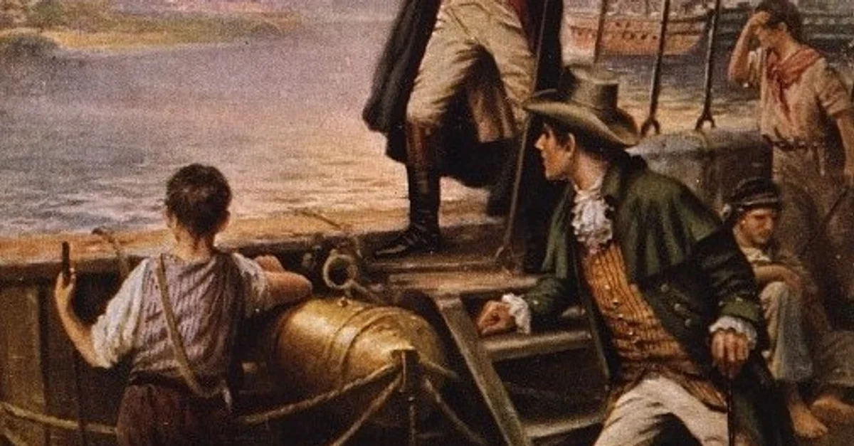 This painting shows Francis Scott Key standing on a ship whilst pointing at the US flag over Fort McHenry during the Battle of Baltimore in 1814. His poem about the British bombardment of the fort, "Defense of Fort M'Henry," serves as the basis for the lyrics of the anthem of the United States: "The Star Spangled Banner."