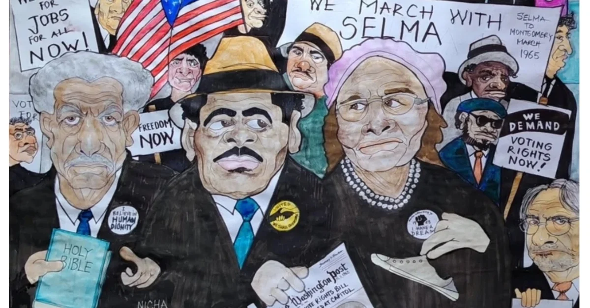 A gouache on paper painting titled The Selma Marches 1965 by Nicha Sursock. This is part of a series of 43 works representing the history of the USA.
