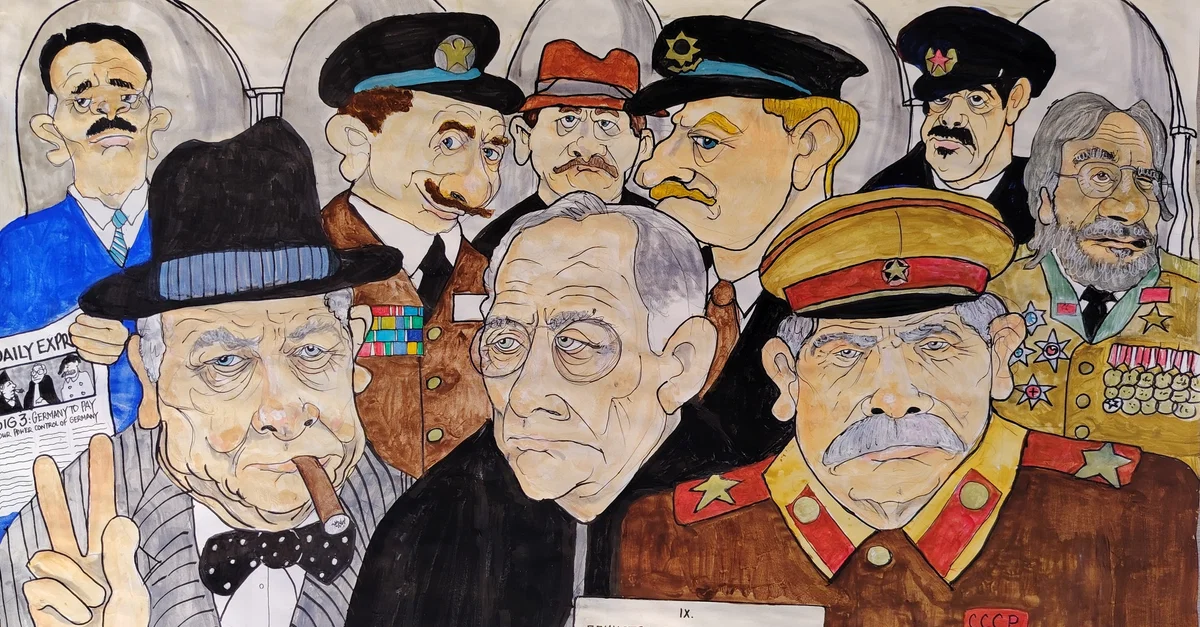 The Yalta conference, February 1945. The big three: Stalin, Churchill and Roosevelt, posing with their aides in front of the Livadia Palace in Yalta, deciding Europe's fate and laying the foundations of the postwar order.