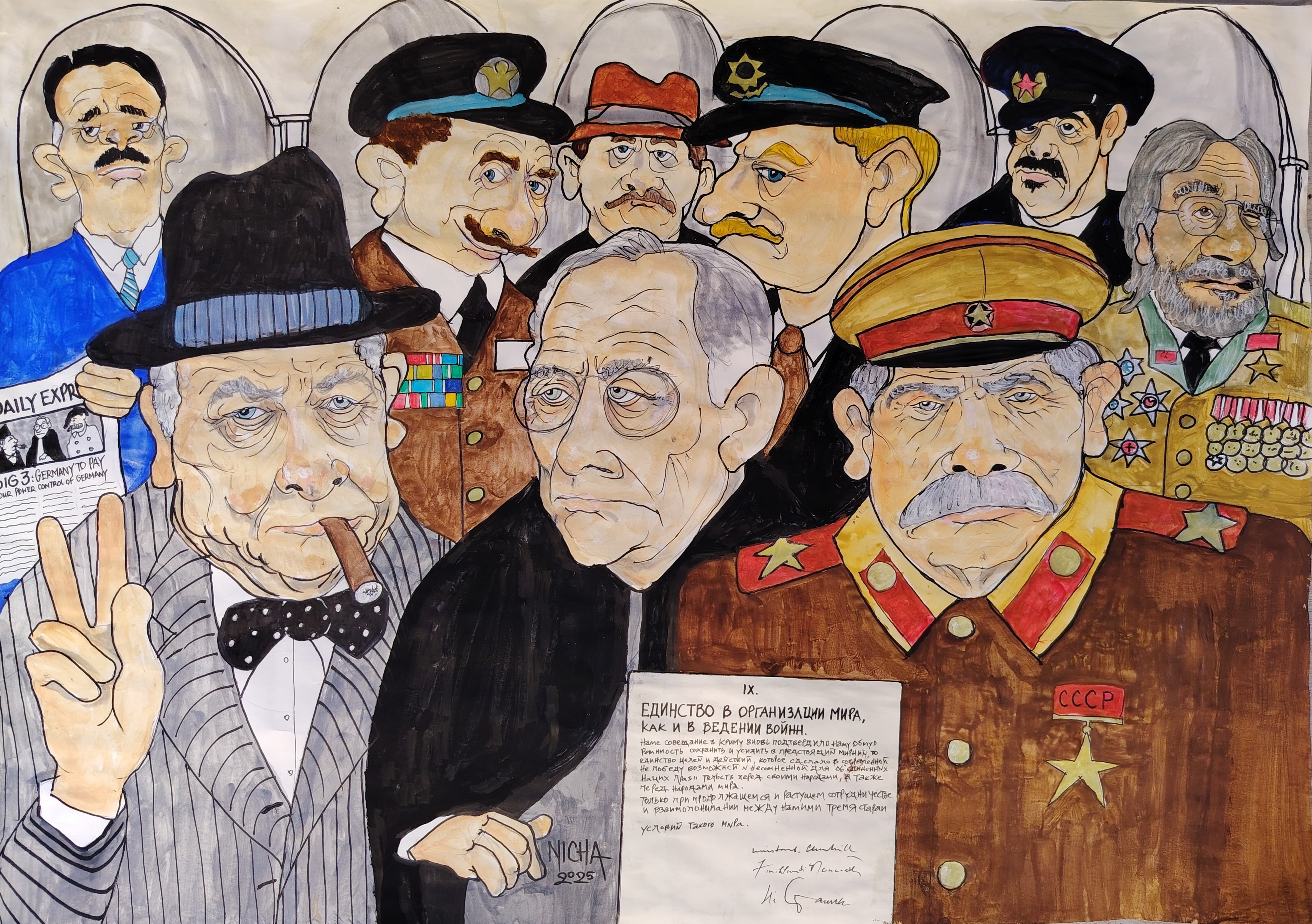 A gouache on paper painting titled Yalta 1945 by Nicha Sursock. This is part of a series of 43 works representing the history of the USA.