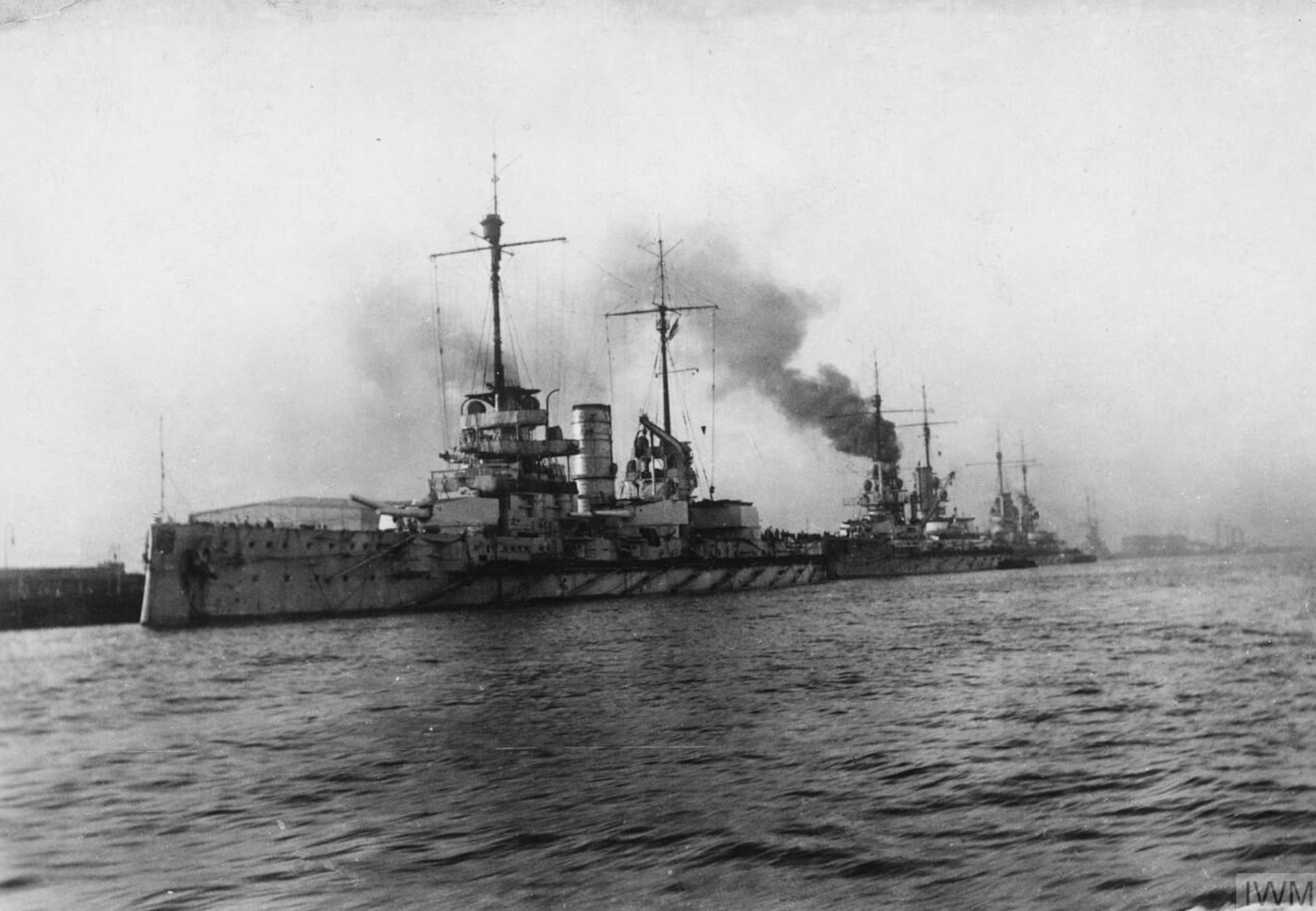 A photograph of First World War (1914-18) German dreadnought warships in port. Unknown date or location. (Imperial War Museums)