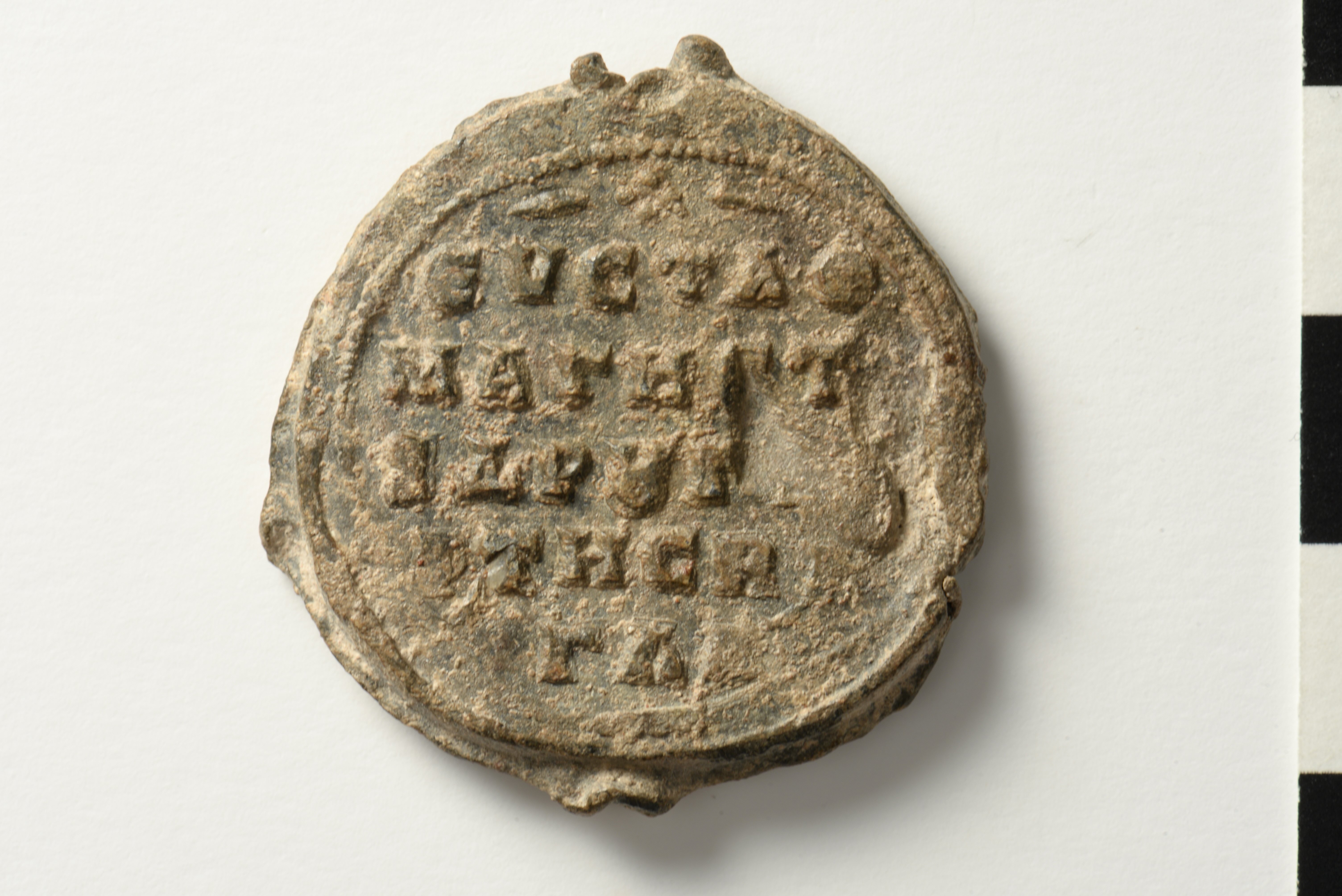 This 11th-century Byzantine seal is presumed to be the official seal of Eustathios Rhomaios (DUMBARTON OAKS BZS.1958.106.5598). The date as well as the title and office on the seal match those of Rhomaios. It is 33 mm in diameter with a field of 24 mm. This is the reverse side of the seal and reads: