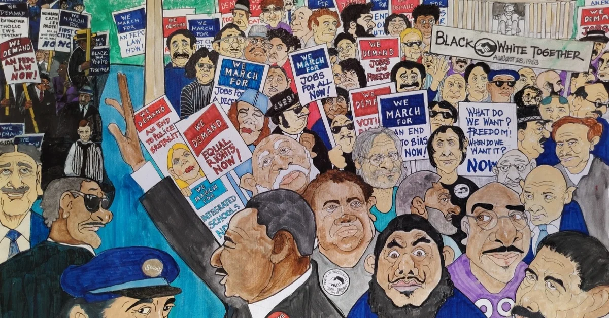 A gouache on paper painting titled The March for Jobs and Freedom 1963 by Nicha Sursock. This is part of a series of 43 works representing the history of the USA.
