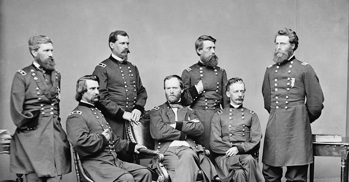 Union Major General William Tecumseh Sherman and his staff officers, photograph by Mathew Brady, c. 1865.