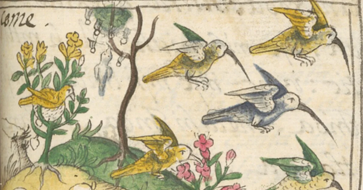 A charm of hummingbirds, book illustration by unknown artist, included in Bernardino de Sahagún's Florentine Codex, "Book XI: Natural Things," p. 53, 1577.