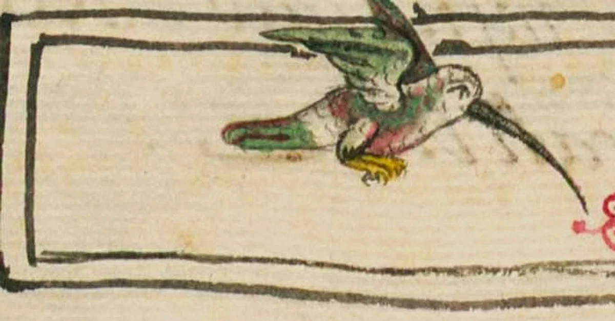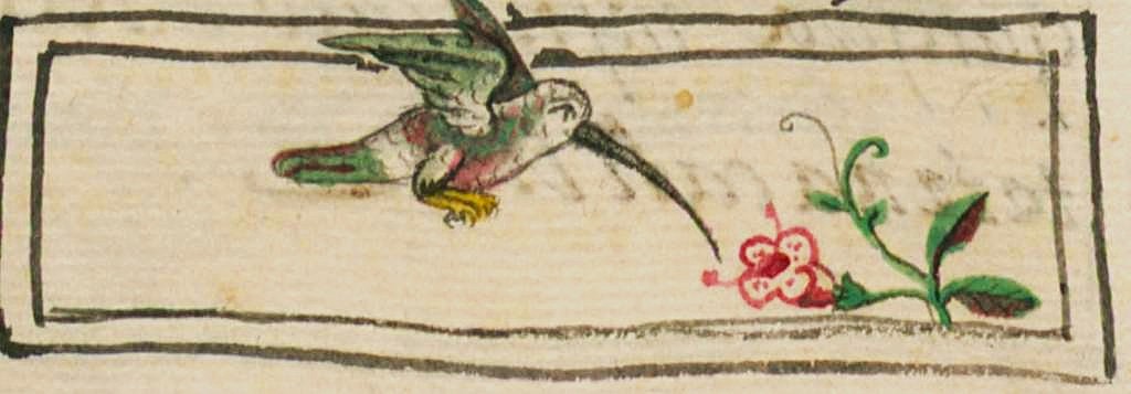 Hummingbird drinking nectar, book illustration by unknown artist, included in Bernardino de Sahagún's Florentine Codex, "Book XI: Natural Things," p. 54, 1577.