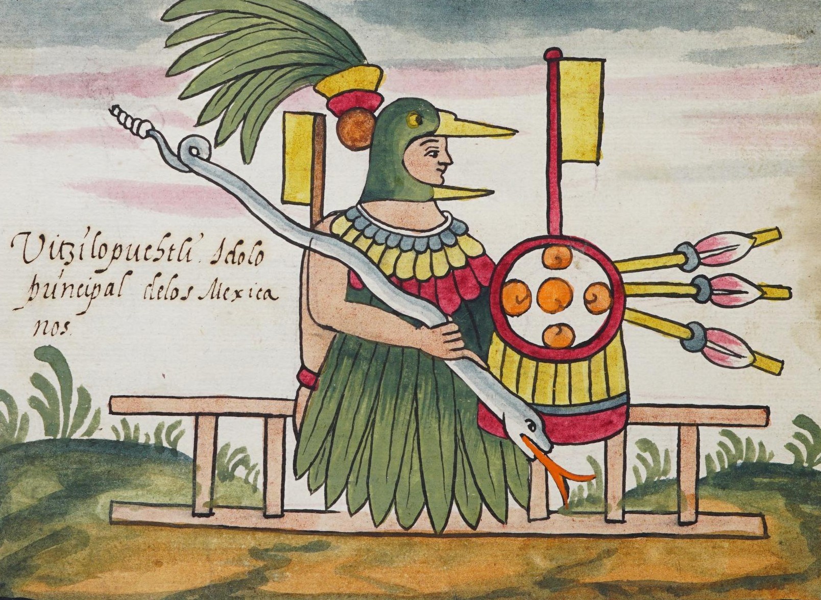 Aztec supreme god Huitzilopochtli with hummingbird-inspired look, book illustration by unknown artist, included in the Codex Tovar by Juan de Tovar, p. 240, 1582.