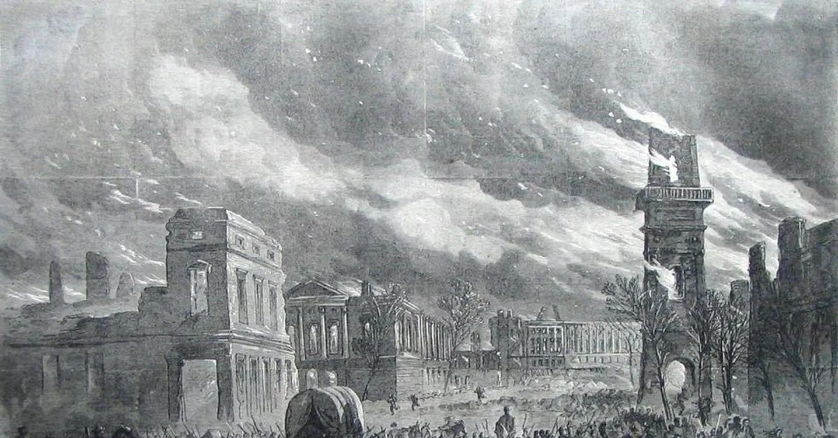 A depiction of the burning of Columbia, South Carolina, on 17 February 1865 during the American Civil War, illustration by William Waud in Harper's Weekly, 8 April 1865. University of Michigan Library Digital Collections.