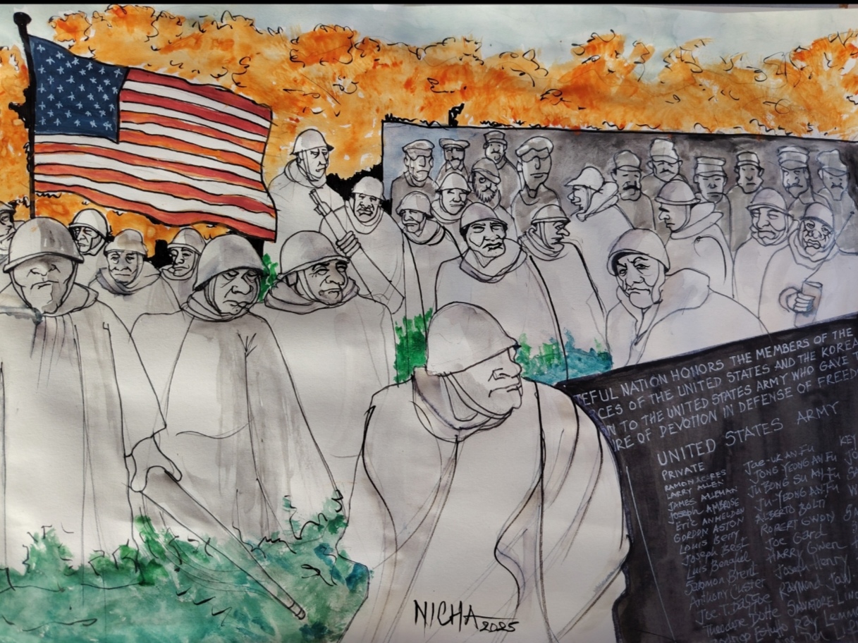 This work depicts the 19 Stainless Steel statues of soldiers of the Korean War Memorial representing the service members who fought in that conflict. Behind them, Juniper bushes that symbolize the rice paddies of Korea, and the wall of remembrance with the names of the fallen.