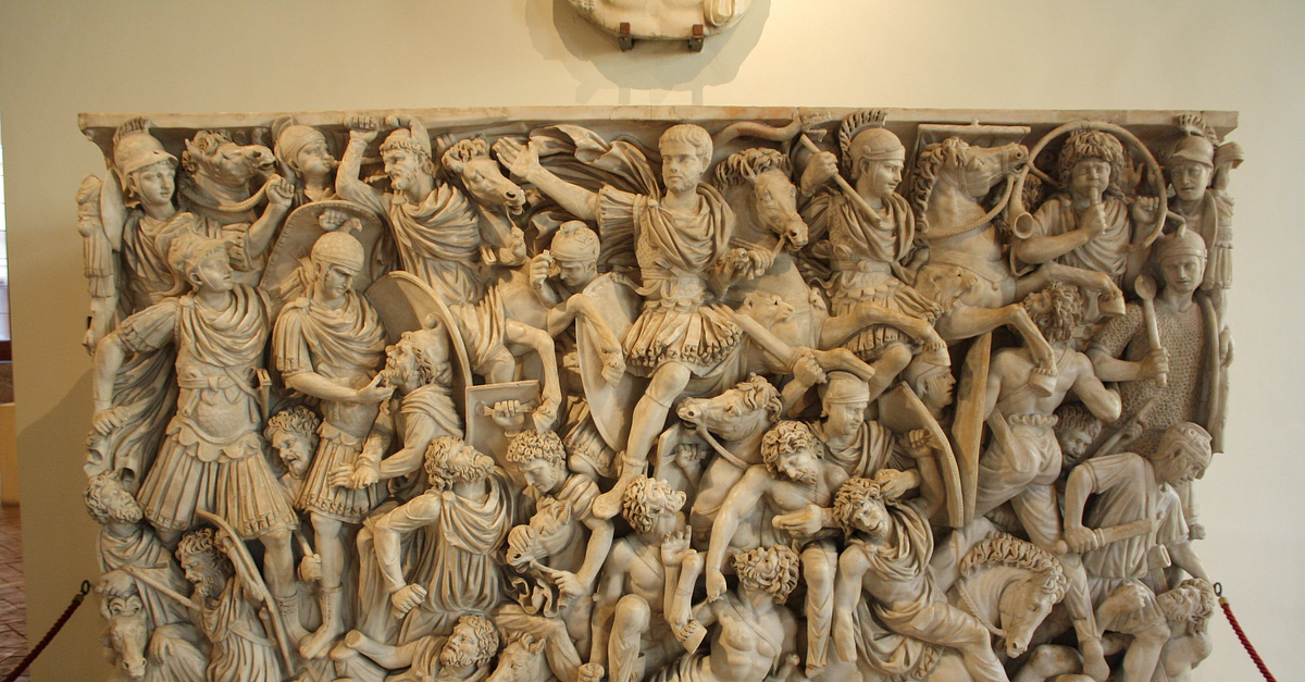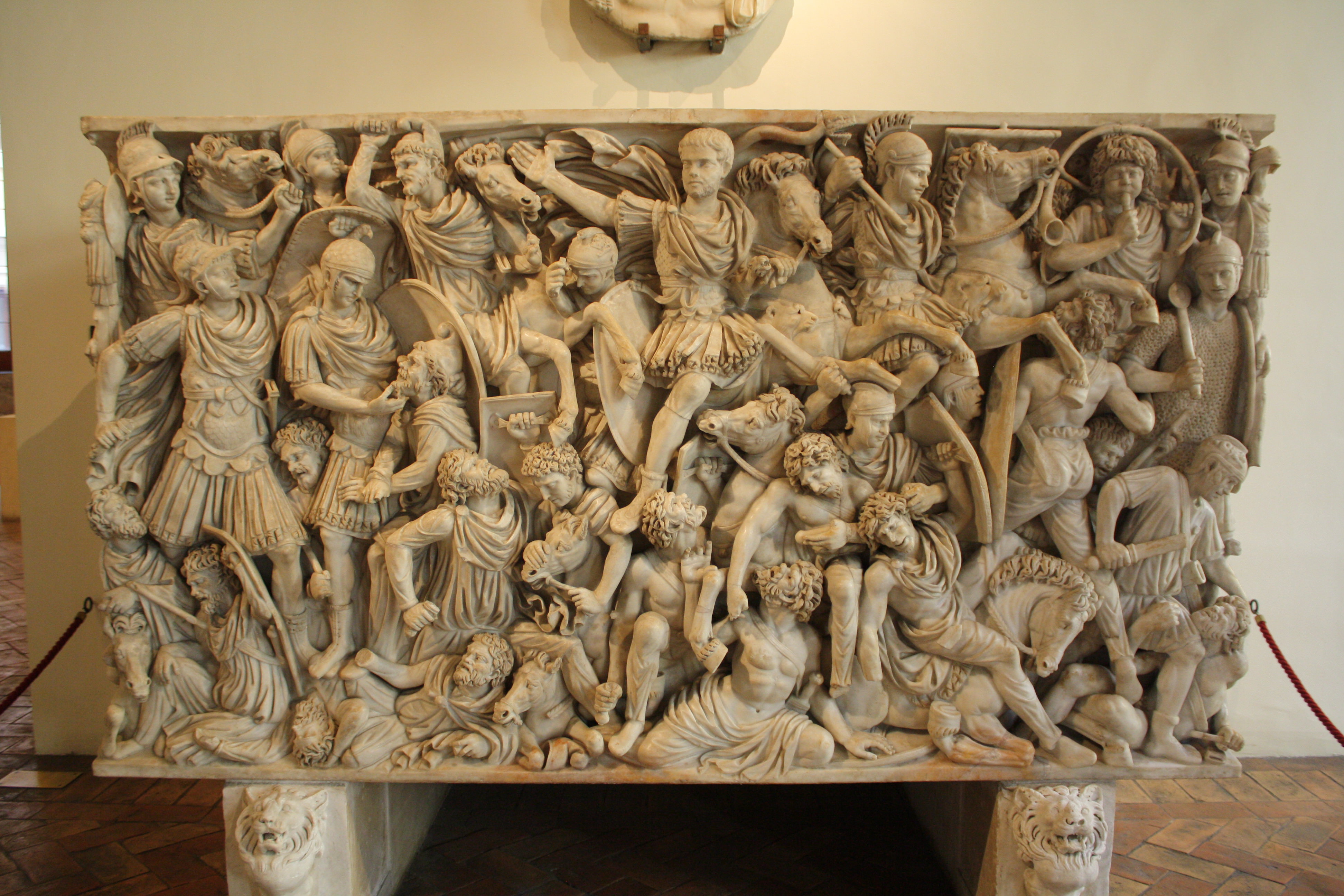 The Roman sarcophagus known as the Grand Ludovisi Sarcophagus, discovered near the Porta Tiburtina in Rome. The front scene depicts three layers of narrative: at the top are victorious Roman soldiers, in the middle are Romans fighting 'barbarians' and at the bottom level are defeated and dying 'barbarians'. Proconnesian marble, 2nd to 3rd century CE. (Palazzo Altemps, Rome)