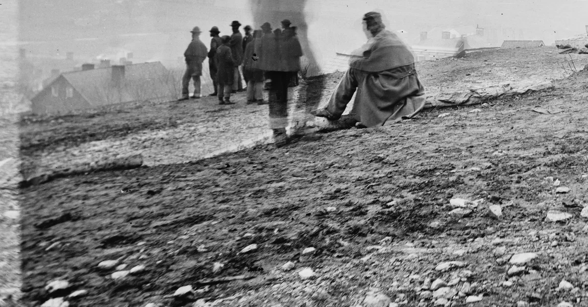 Photographed here are onlookers spectating the Battle of Nashville (15-16 December 1864), a decisive Federal victory in the American Civil War in which the Confederate Army of Tennessee, taking casualties it could not bear, was effectively removed from the conflict.