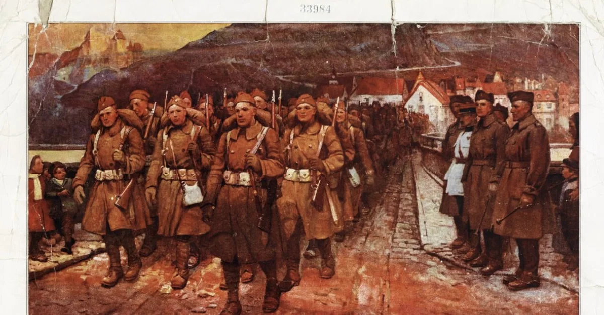 A recruitment poster showing 'doughboys', the nickname for US troops in the First World War (1914-18).
