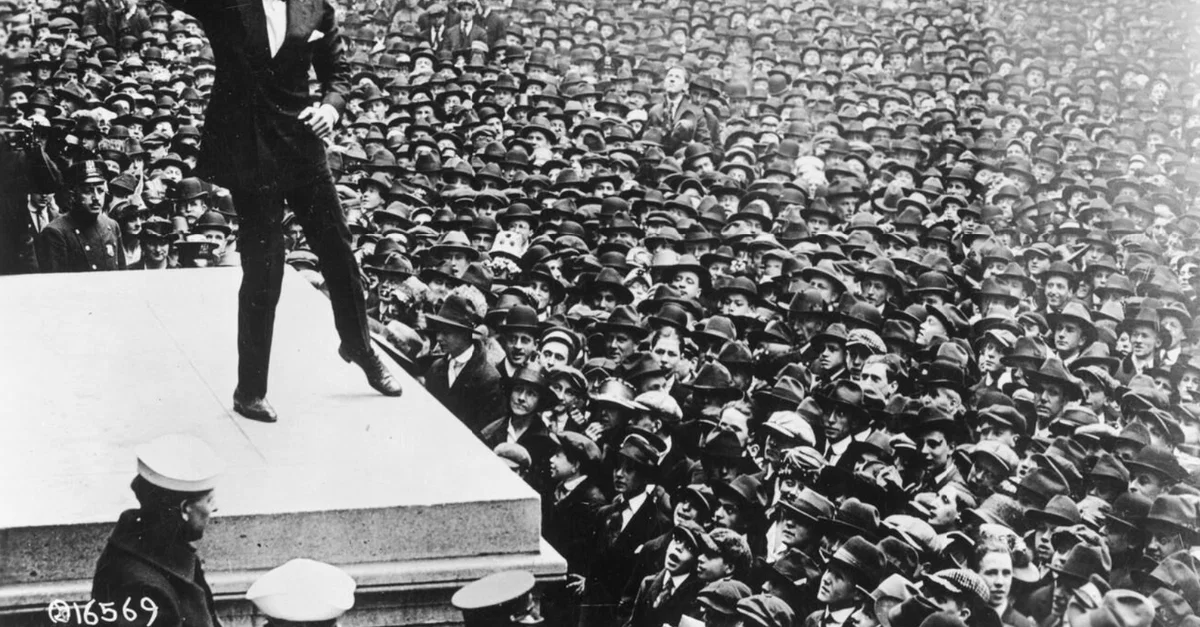 An April 1918 photograph showing the actor Douglas Fairbanks and a crowd during the campaign to raise funds for United States Liberty Bonds during the First World War (1914-18).