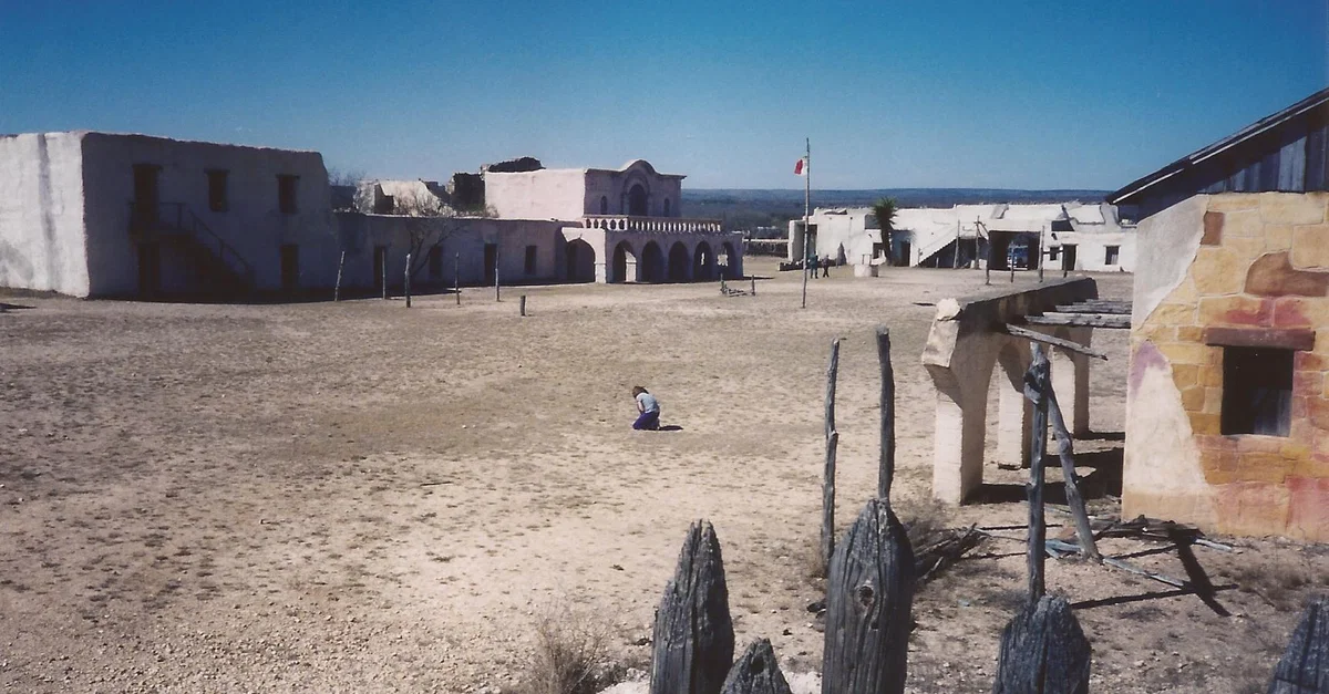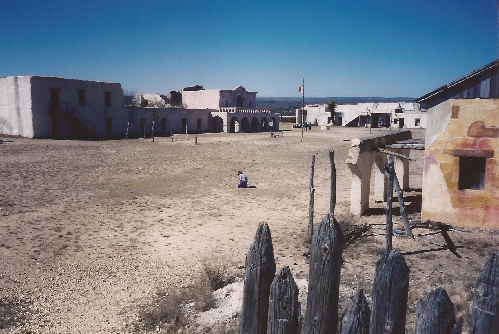 San Antonio de Bexar movie set built in Bracketville, Texas for the filming of The Alamo (1960), starring John Wayne. Photograph by Betsy Mark, 2004. Figure in photo is Emily Mark, age 9.