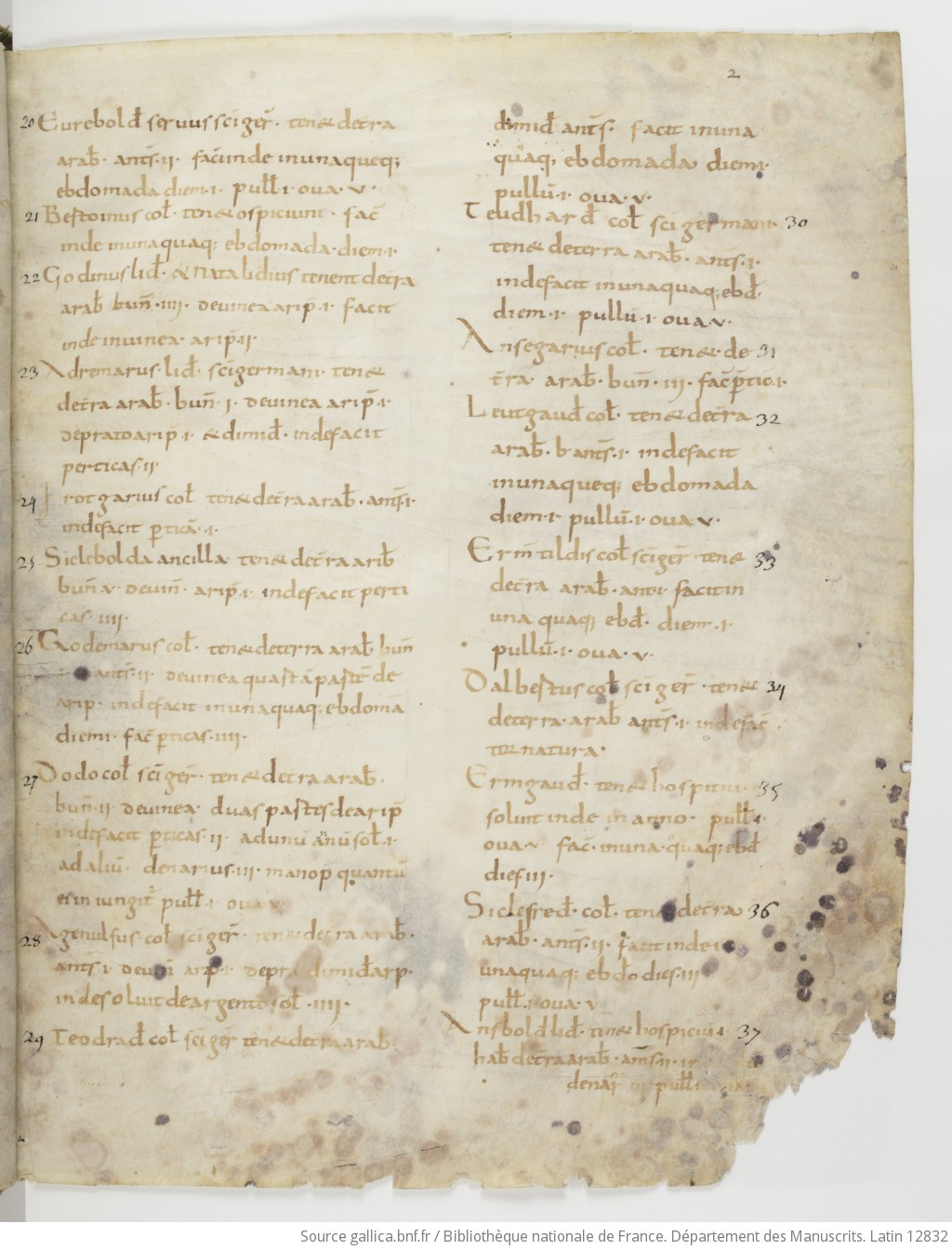 This is the folio 2 recto of the Bibliothèque nationale de France, Latin 12832, a list of name of peasants attached to the monastery of St.-Germain-des-Prés, compiled by its abbot, Irminon, in the 9th century.