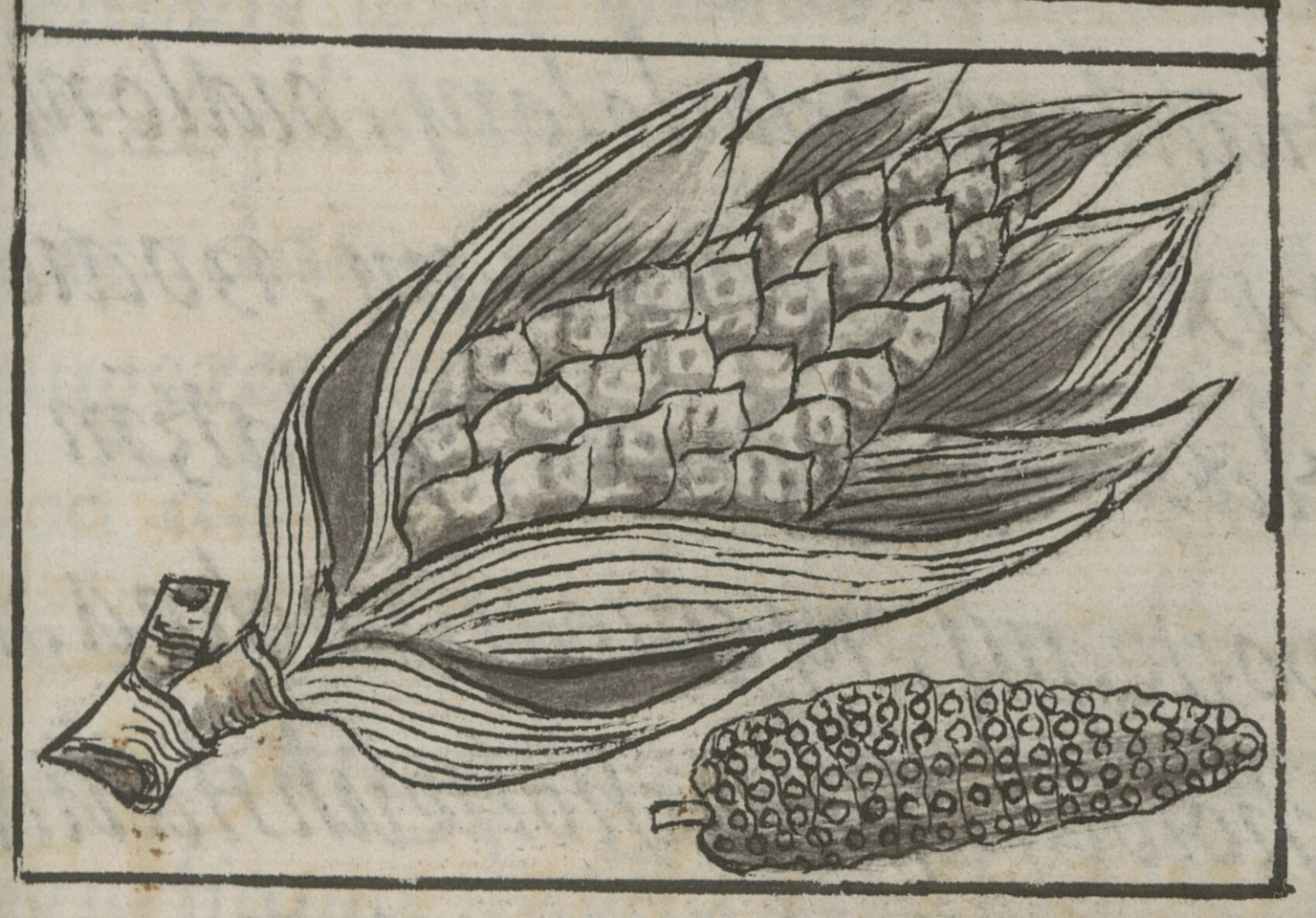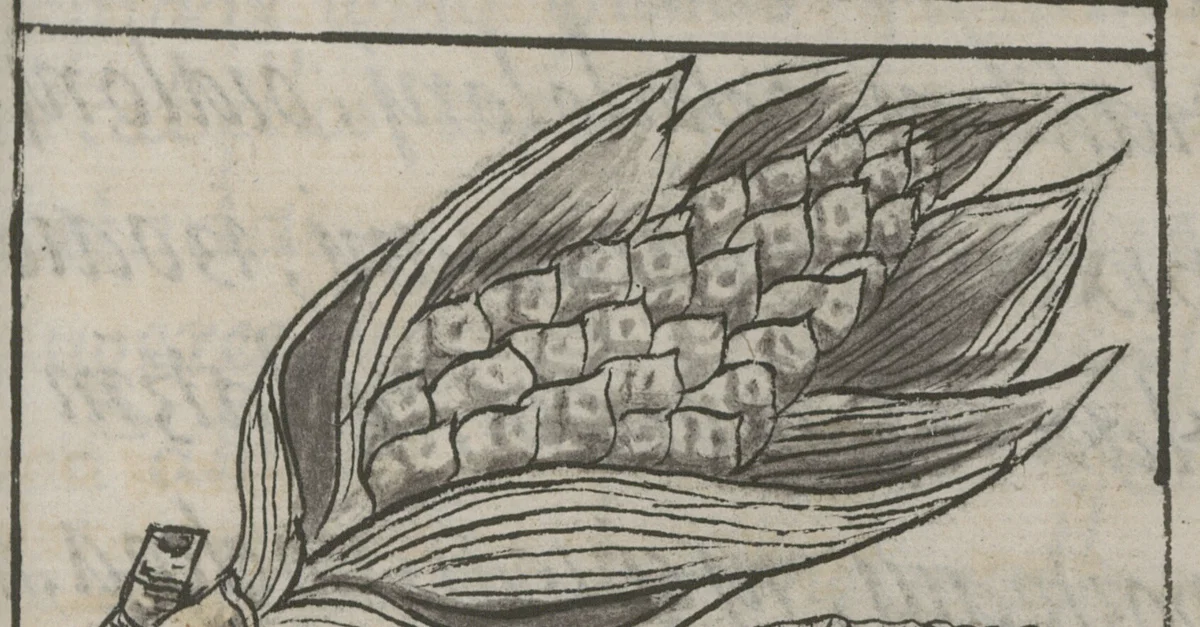 A depiction of a maize plant, one of the staple crops of the Aztec peoples of Mexico. The image shows the structural details of the ear with husk, kernels, and partial stem. The Florentine Codex includes many depictions of maize, featuring it in a number of different aspects of Aztec life.