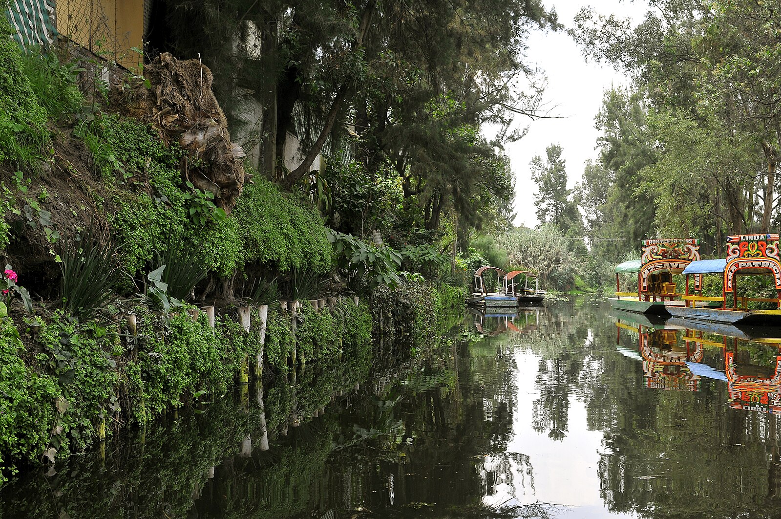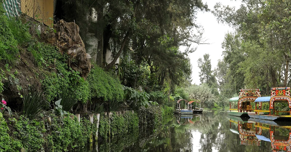 Flat-bottomed, vibrantly colored tourist boats known as trajineras pass by a chinampa, a man-made agricultural island, in the canals of Xochimilco. The chinampas and trajineras make the canals of Xochimilco a popular tourist attraction in Mexico.