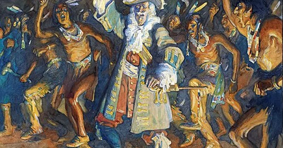 Louis de Buade, Comte de Frontenac, the governor-general of New France, performs a war dance with his Native American (likely Wabanaki) allies in 1690, at the height of King William's War. By Charles William Jefferys, circa 1914. (Library and Archives Canada)