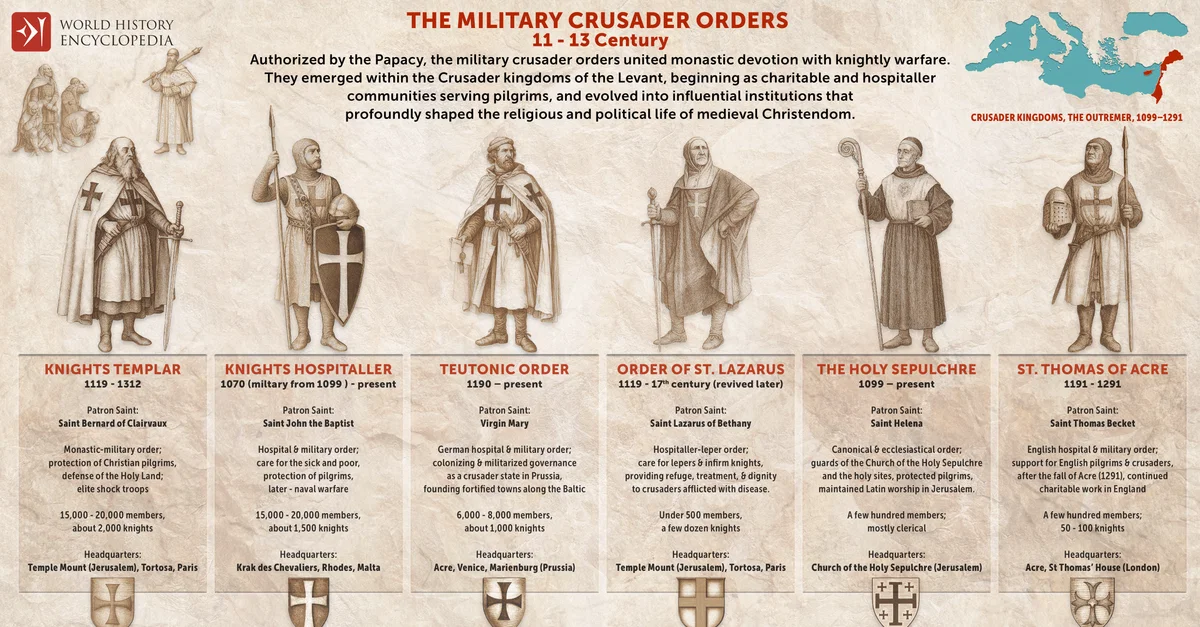 An infographic showing the Military Crusader Orders which emerged as unique institutions blending monastic devotion with martial duty. Founded in the wake of the First Crusade (1096–1099), their primary purpose was to protect pilgrims and defend the Crusader States in the Holy Land. The most prominent among them, the Knights Templar (from c. 1119), the Knights Hospitaller (military from. c. 1099), and the Teutonic Order (from c. 1190), combined vows of poverty, chastity, and obedience with a permanent commitment to holy warfare. Their formation reflected the changing nature of crusading, in which religious zeal, military necessity, and emerging notions of chivalric piety became intertwined.
