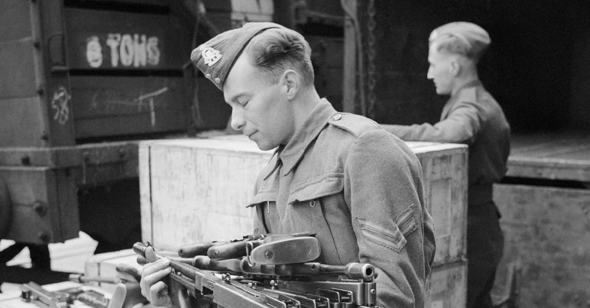 A March 1942 photograph showing a British Army corporal carrying Thompson 'Tommy' submachine guns given through the US Lend-Lease programme during the Second World War (1939-45).