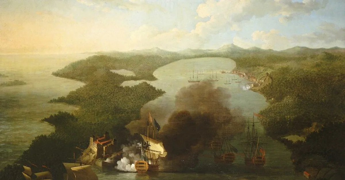 Scott's painting depicts the capture of the Spanish port of Portobelo by a British fleet on 21 November 1739 during the War of Jenkins' Ear (1739-48).