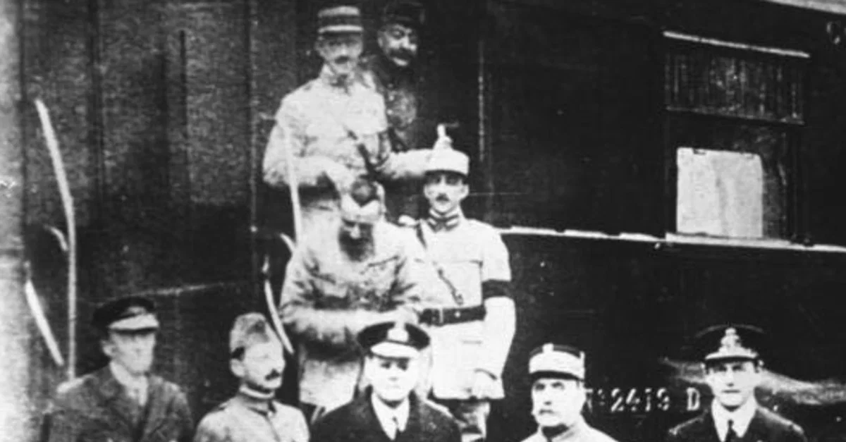 A photograph showing Supreme Allied Commander Marshal Ferdinand Foch (standing, second on the right) after the signing of the armistice with Germany on 11 November 1918 which ended the First World War. The train was Marshal Foch's campaign headquarters and is here stopped in the Forest of Compiègne.