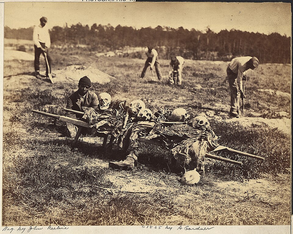 A year after the Battle of Cold Harbor (31 May to 12 June 1864), burial delegations collect the skeletons of those killed in the battle.
