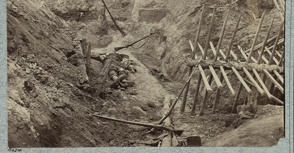 Dead Confederate in the trenches of Fort Mahone at the end of the Siege of Petersburg during the American Civil War, photograph by T. C. Roche, 3 April 1865.