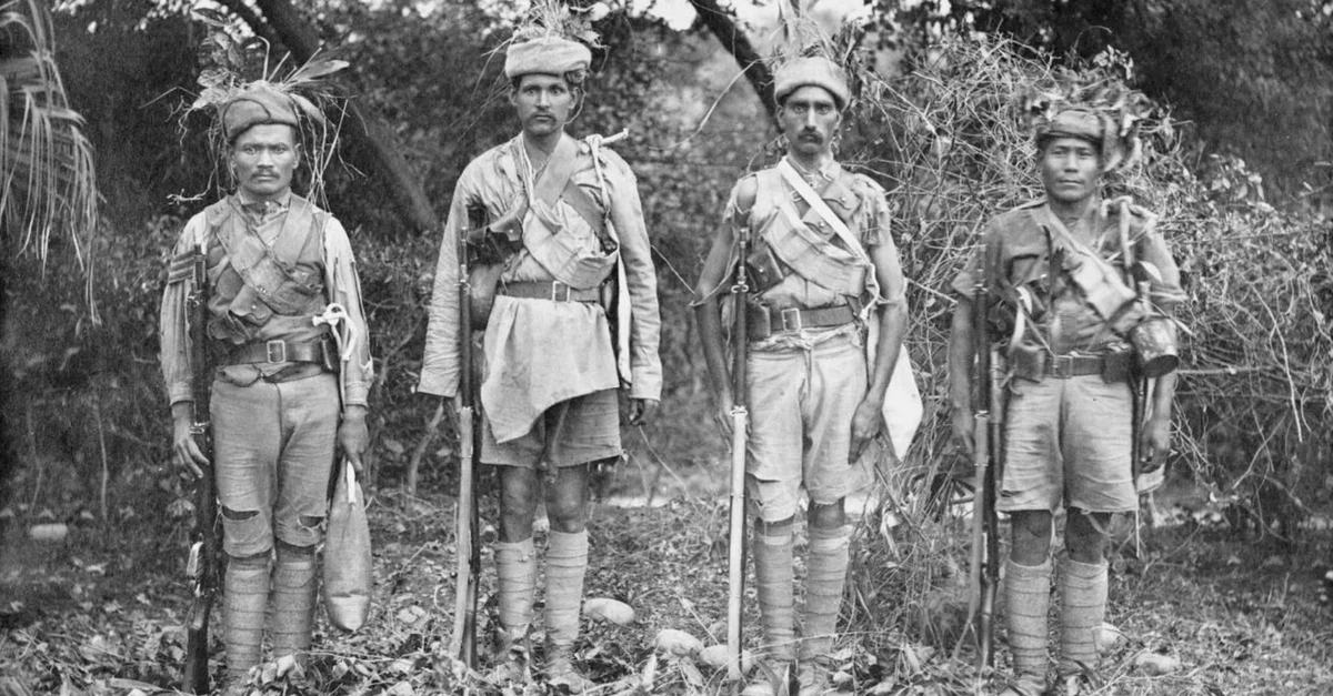 A 1917 photograph of four members of the 2nd Kashmir Rifles in East Africa. Colonial troops were used by all sides and in most theatres of the war.