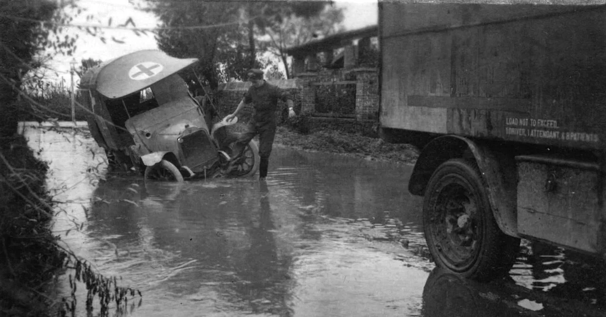 A photograph of a British Red Cross ambulance in difficulties on the Italian Front during the First World War (1914-18).