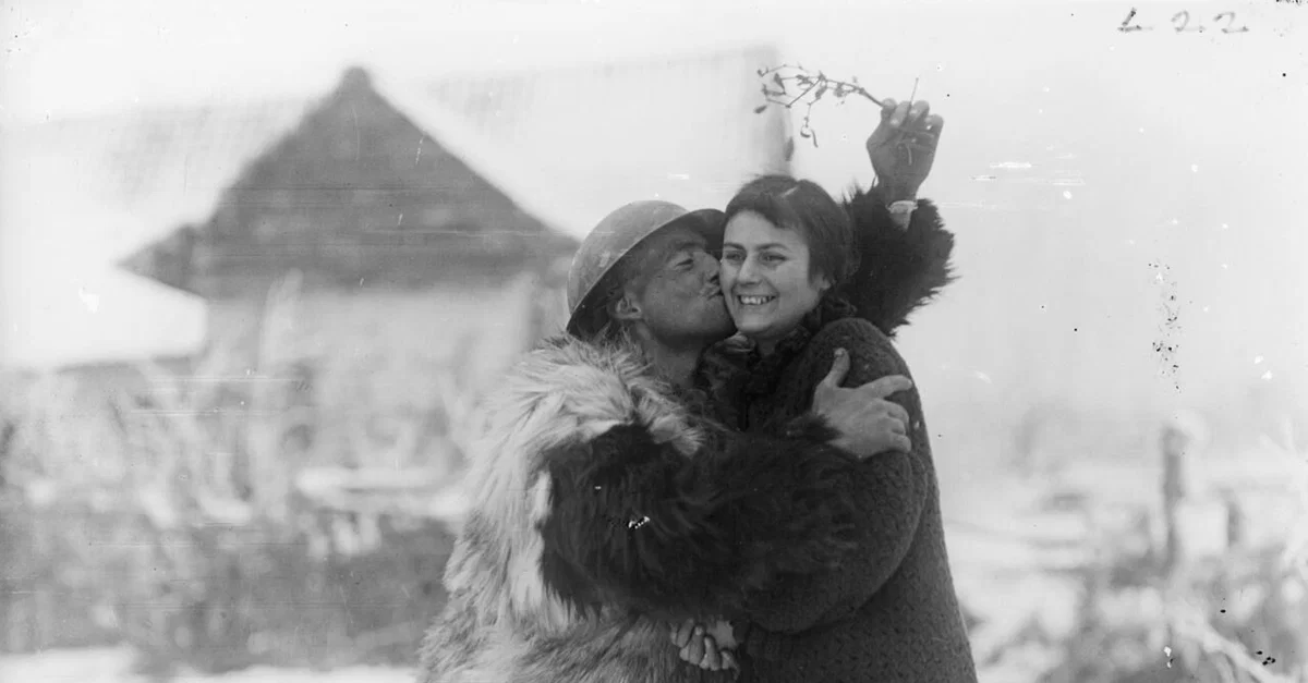 A December 1917 photograph of a British soldier kissing a French farm worker under a sprig of mistletoe during the First World War (1914-18).