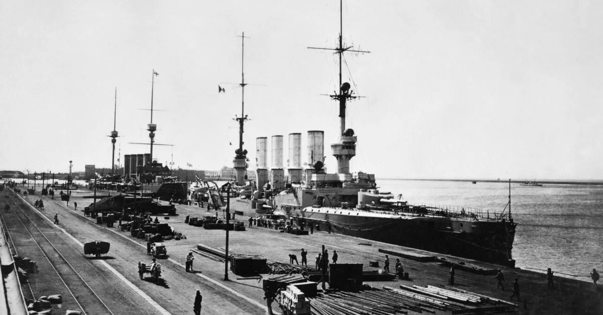 A mid-1914 photograph of the German Imperial Navy warship SMS Scharnhorst docked at the German colony of Tsingtao, mainland China. Tsingtao was captured in November 1914 after an amphibious attack by Japanese and British forces during the First World War (1914-18).
