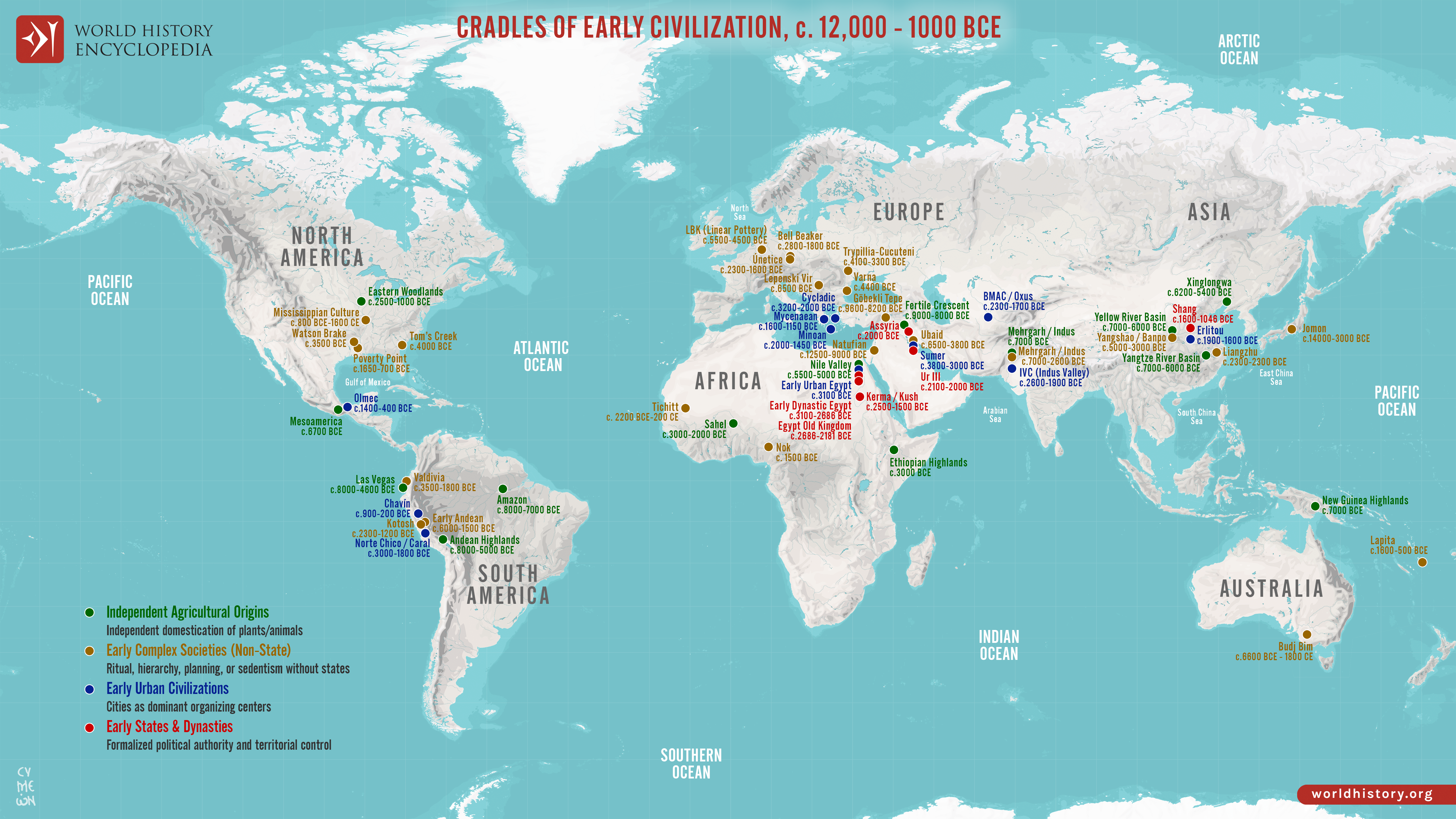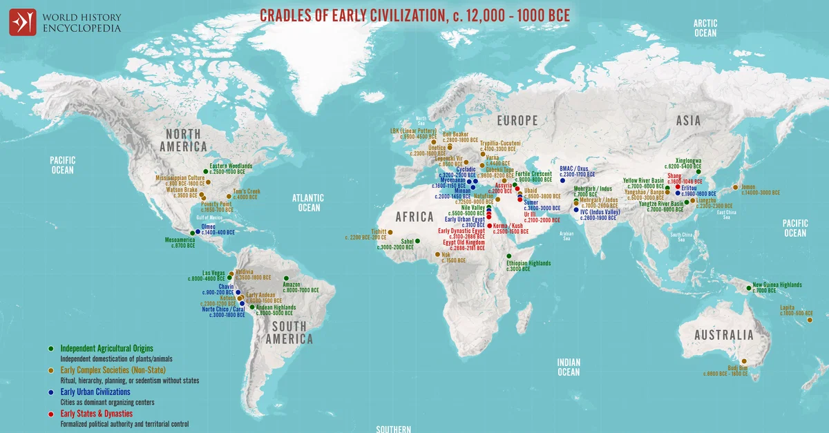 Netchev, S. (2026, January 23). Map of the Cradles of Early Civilization: Global Pathways to Agriculture, Urban Centers & Early States. World History Encyclopedia. https://www.worldhistory.org/image/21507/map-of-the-cradles-of-early-civilization/