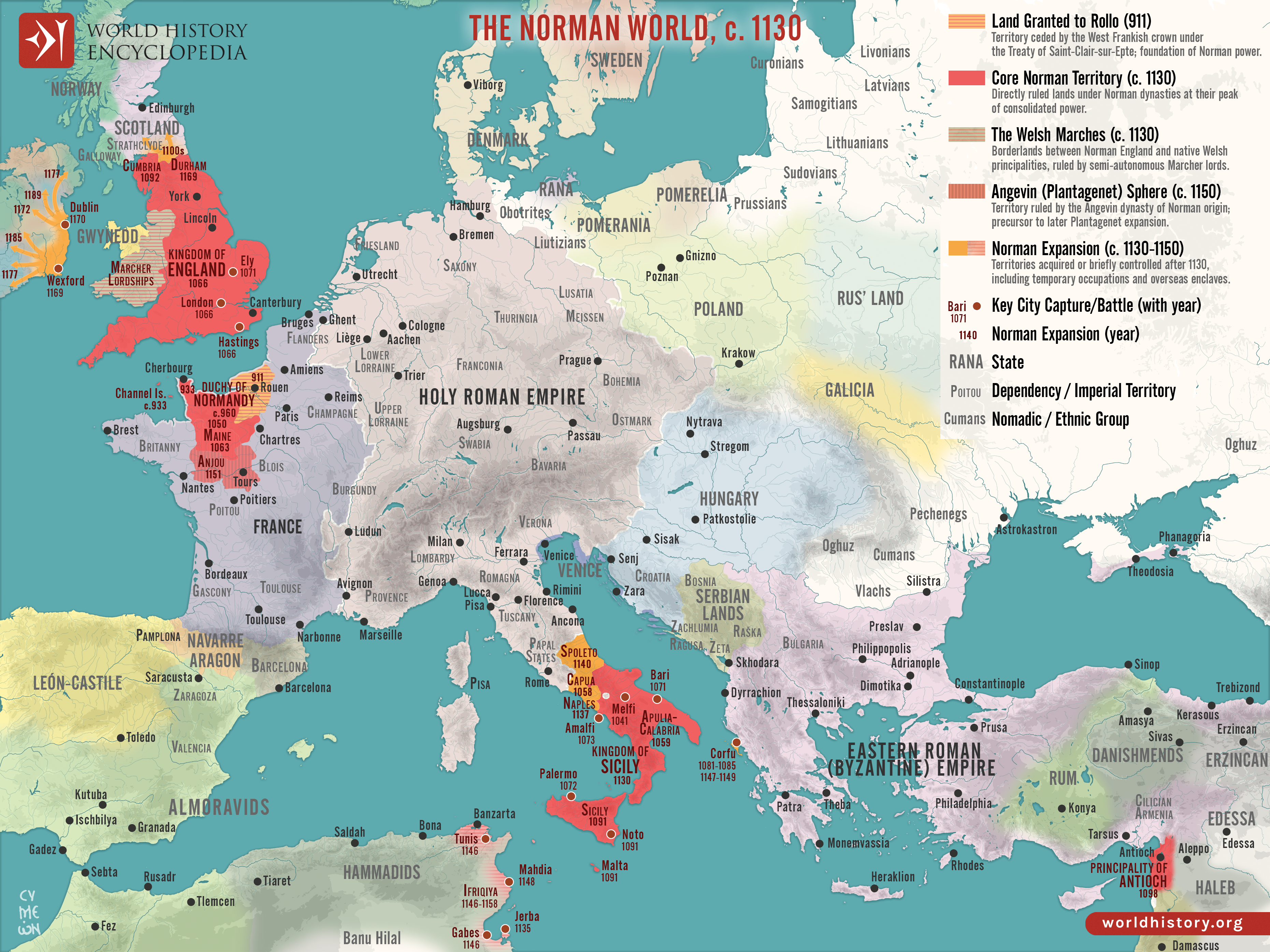 Netchev, S. (2026, January 12). Map of the Norman World, c. 1130: Conquest, Power and State-Building. World History Encyclopedia. https://www.worldhistory.org/image/21513/map-of-the-norman-world-c-1130/