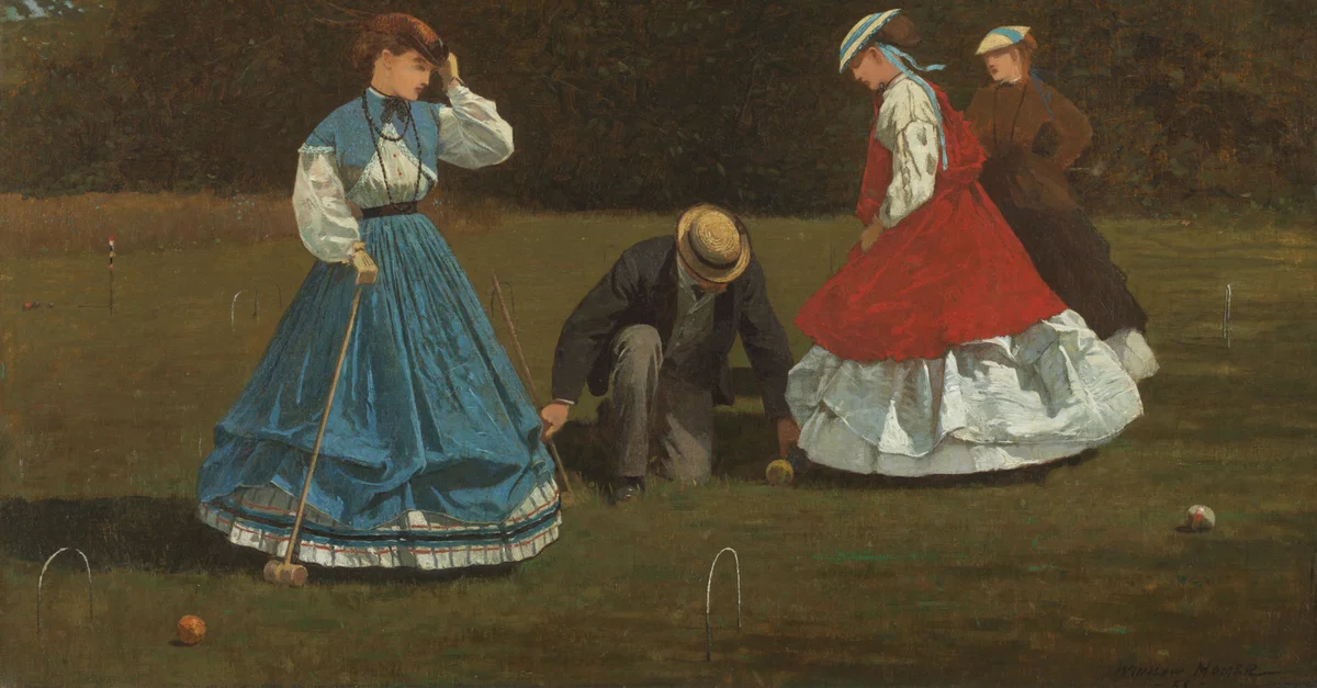 An 1866 oil on canvas painting by Winslow Homer (1836-1910), The Croquet Scene. This was a popular game in Britain and the United States in this period. The women have hoisted their outer dresses to play the game.