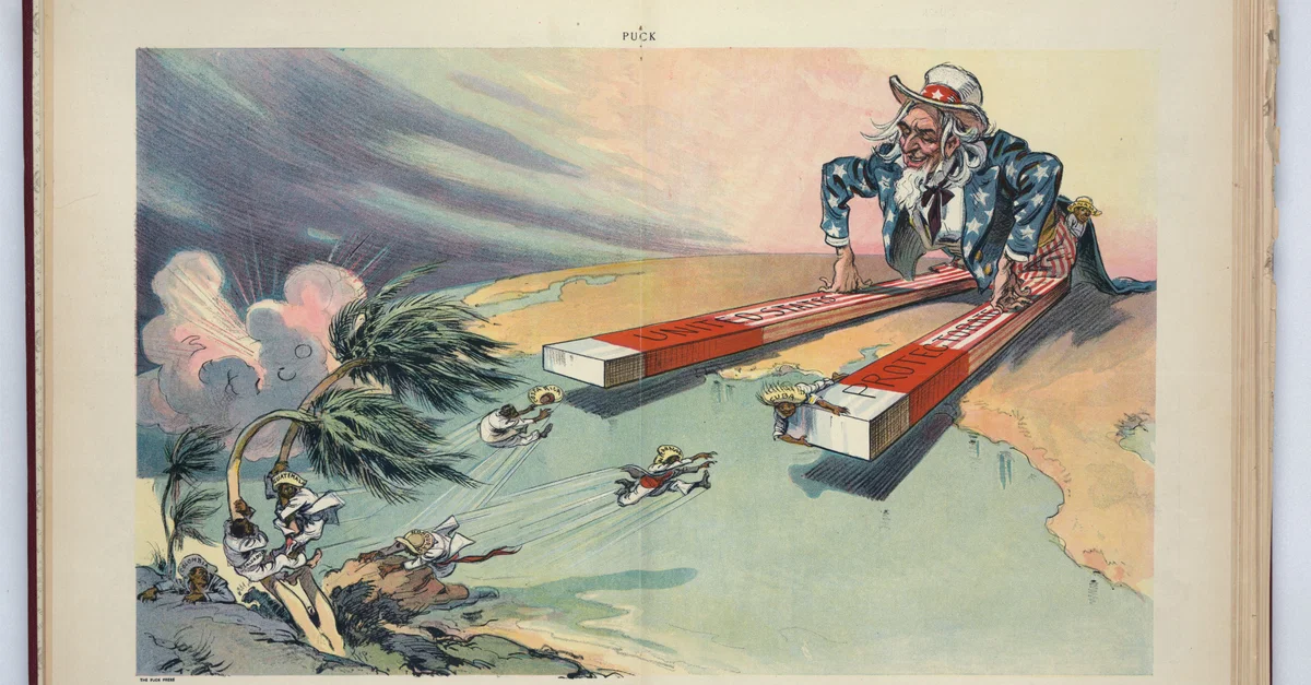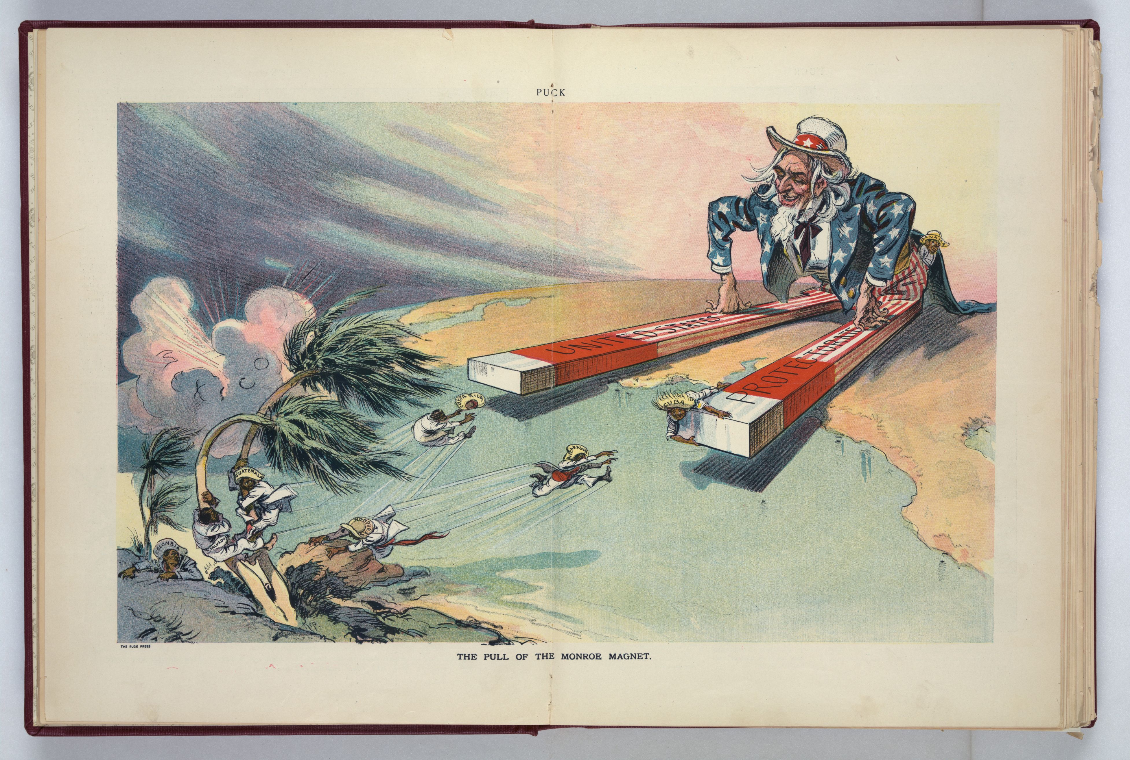 In this cartoon depiction of the Monroe Doctrine, a colossal Uncle Sam, a national personification of the United States, forcibly draws toward himself figures representing the Latin American countries of Cuba, Nicaragua, Costa Rica, Honduras, Guatemala, El Salvador, and Colombia. Panama can be seen already within his pocket.