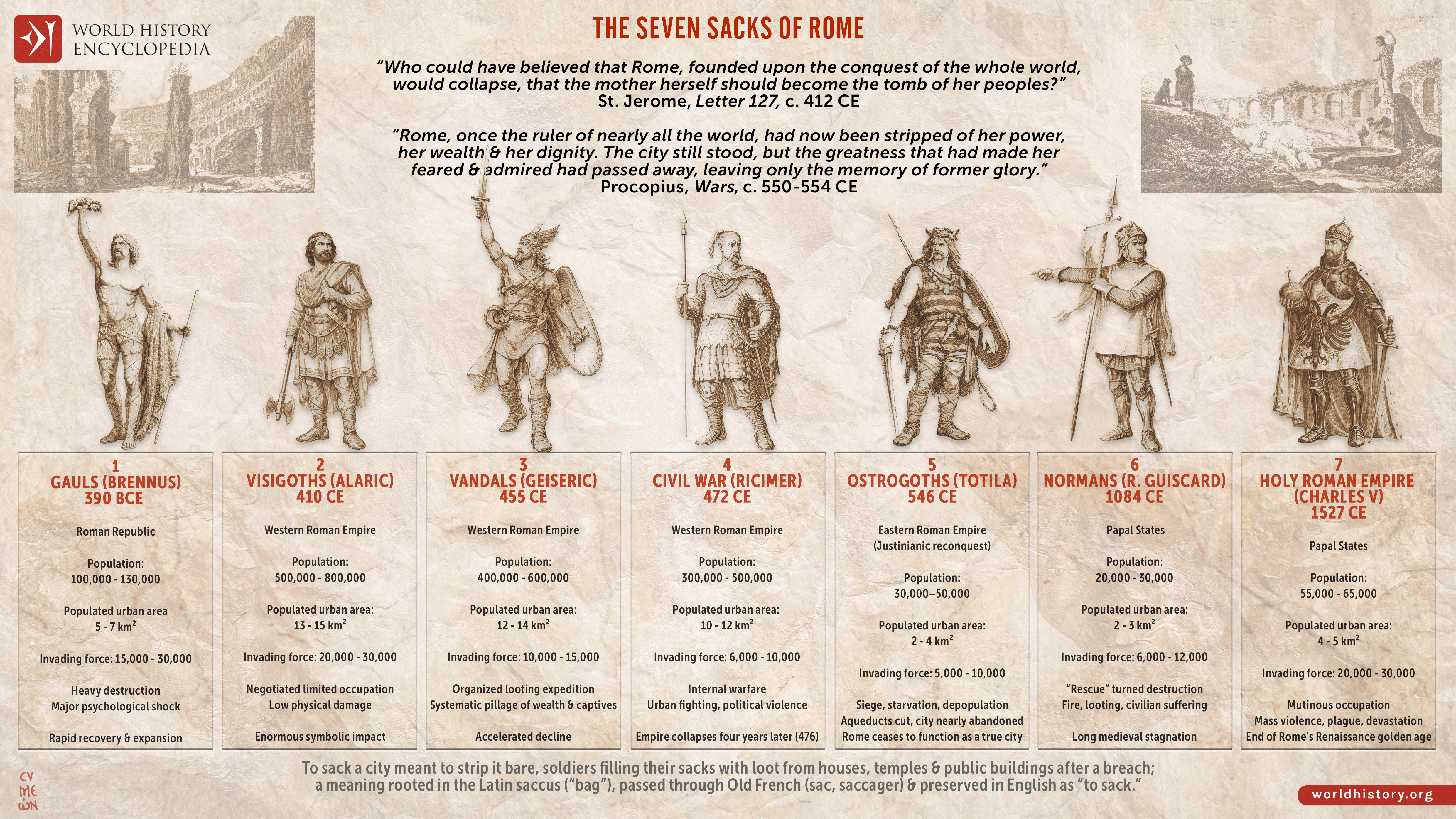 An infographic of the seven times the city of Rome was sacked. Across more than 1,900 years (390 BCE–1527 CE), the sacks of Rome reveal not a single moment of collapse, but a recurring pattern of vulnerability shaped by shifting political systems, military power, and imperial overstretch. From the Republican era through the Western and Eastern Roman Empires and into the early modern period, Rome’s fortunes rose and fell with the structures meant to protect it.