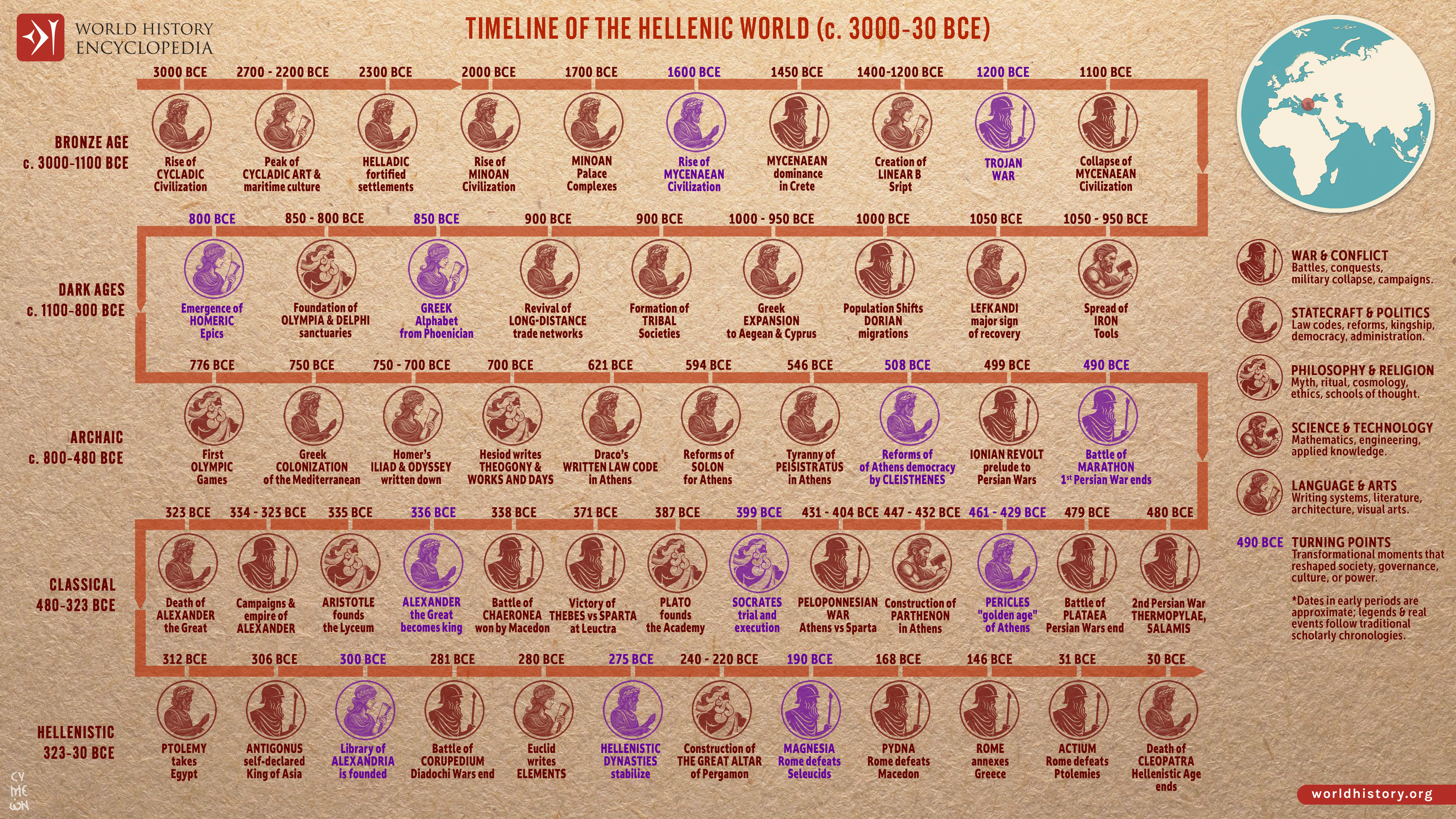 Netchev, Simeon. "Timeline of the Hellenic World (c. 3000-30 BCE): The Rise, Transformation, and Legacy of Ancient Greece." World History Encyclopedia, February 05, 2026. https://www.worldhistory.org/image/21556/timeline-of-the-hellenic-world-c-3000-30-bce/.