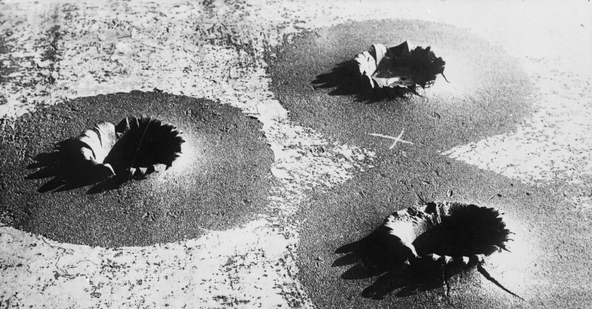 A 1914 photograph showing armour plating on a fortress pierced by shells on the Western Front during the First World War (1914-18).