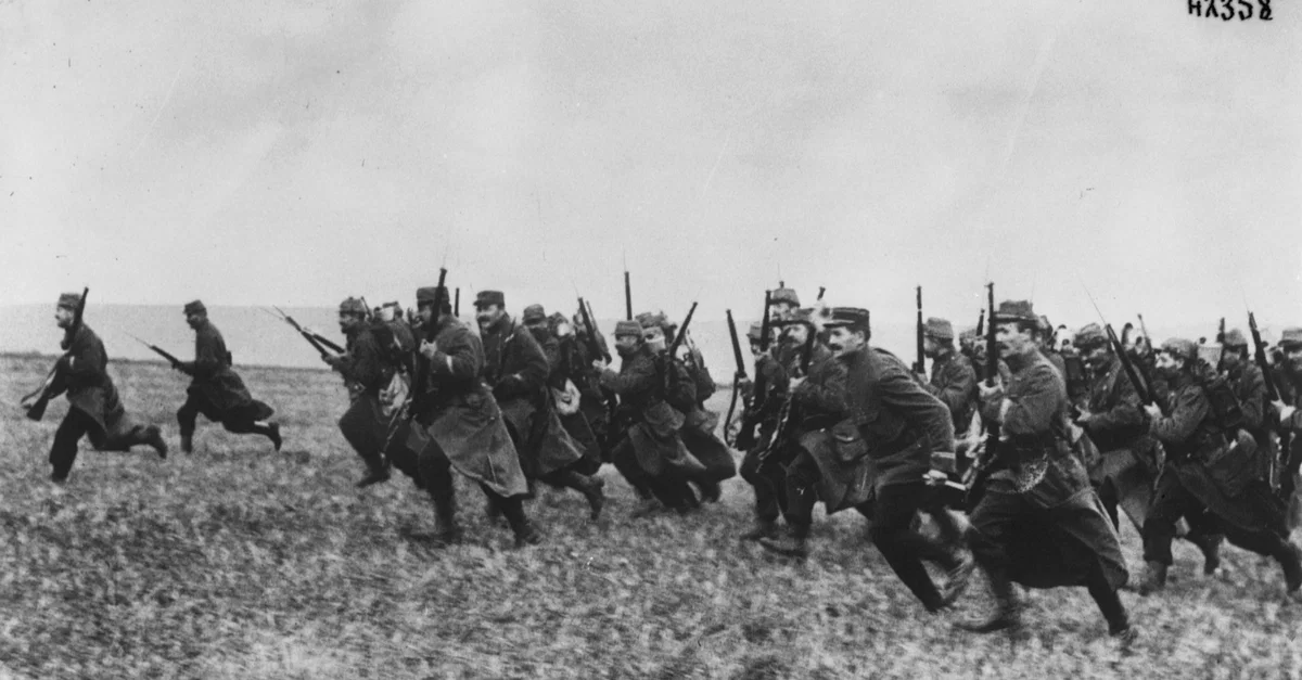 A 1913 photograph of a French infantry charge, a typical tactic used throughout the First World War (1914-18).