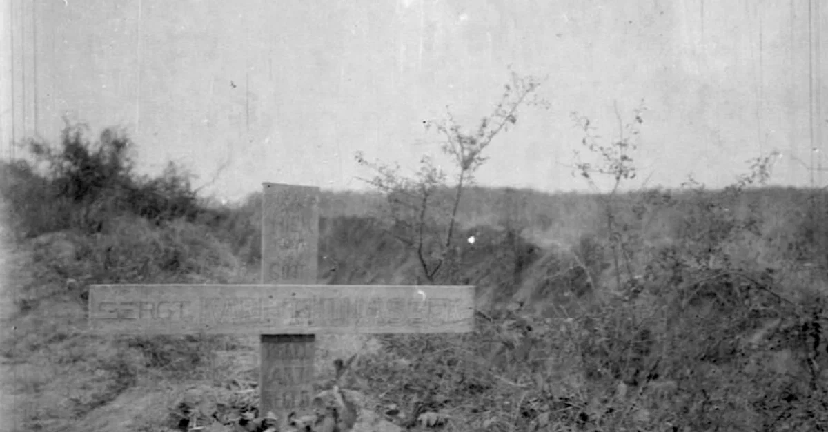 A photograph of a German war grave, that of Sergeant Karl Thomassek (Karol Tomaszek) of the German 5th Field Artillery Regiment. Taken during the German Spring Offensive of 1918. This was the last major offensive action by the German Army of the First World War (1914-18).