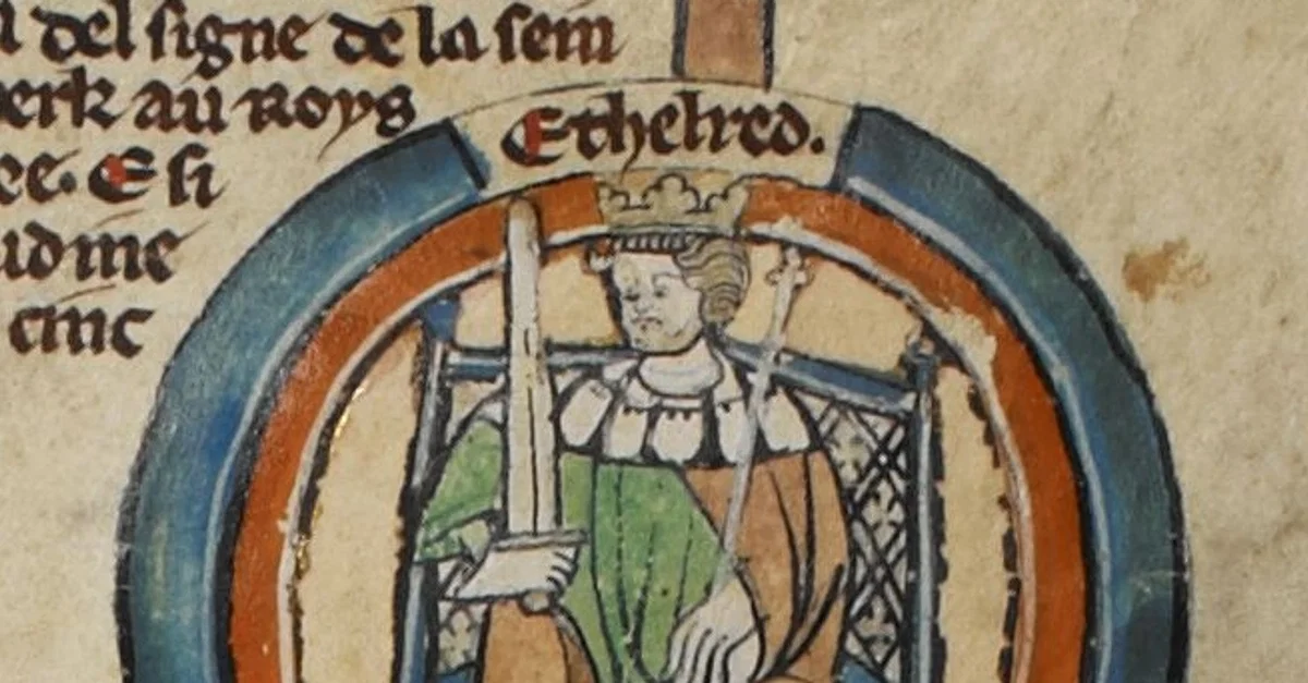 King Aethelred of Wessex, miniature by unknown artist, included in Genealogical roll of the kings of England, London, c. 1300 - 1340.