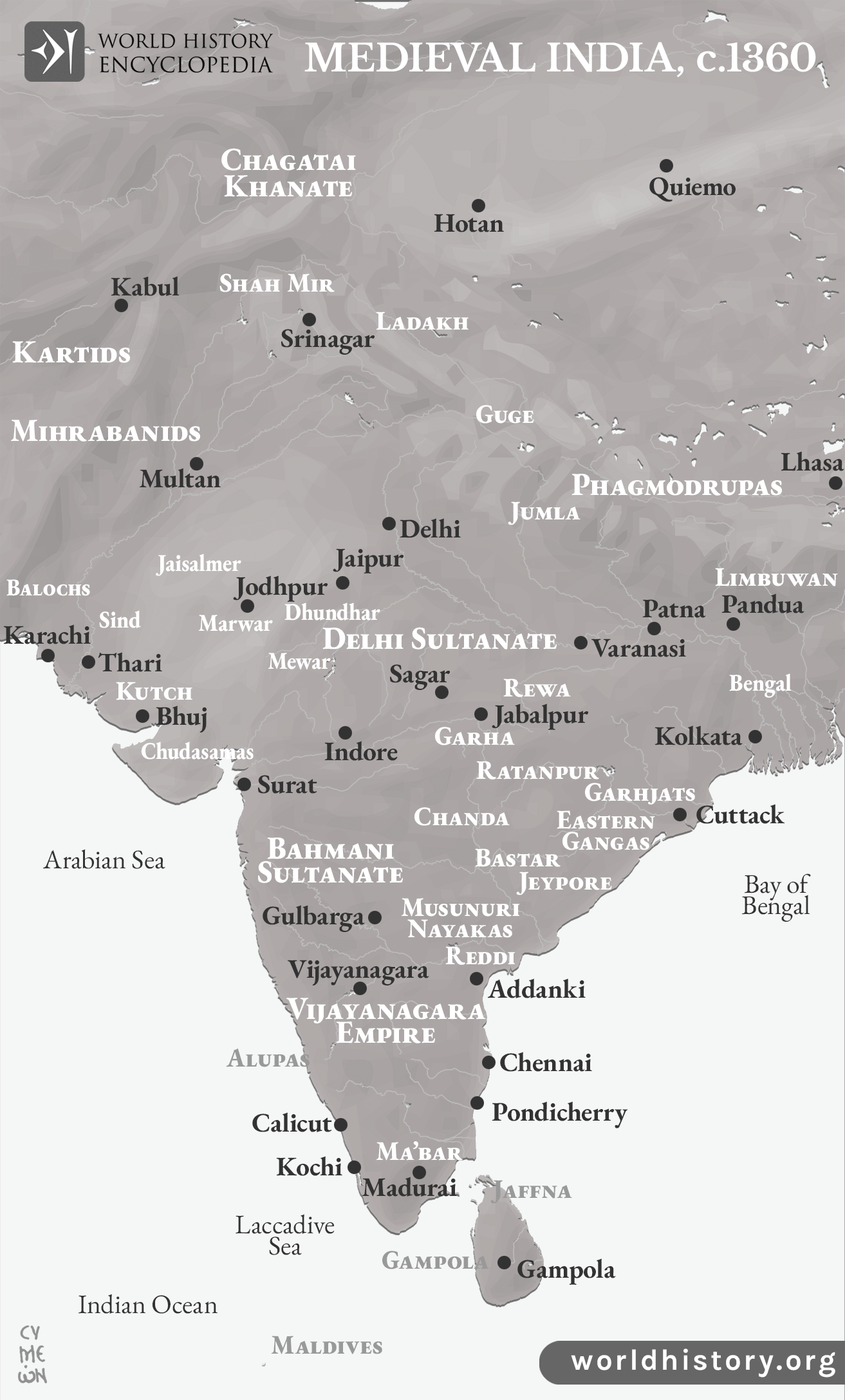 Netchev, S. (2026, February 13). Map of Medieval India, c. 1360. World History Encyclopedia. https://www.worldhistory.org/image/21584/map-of-medieval-india-c-1360/