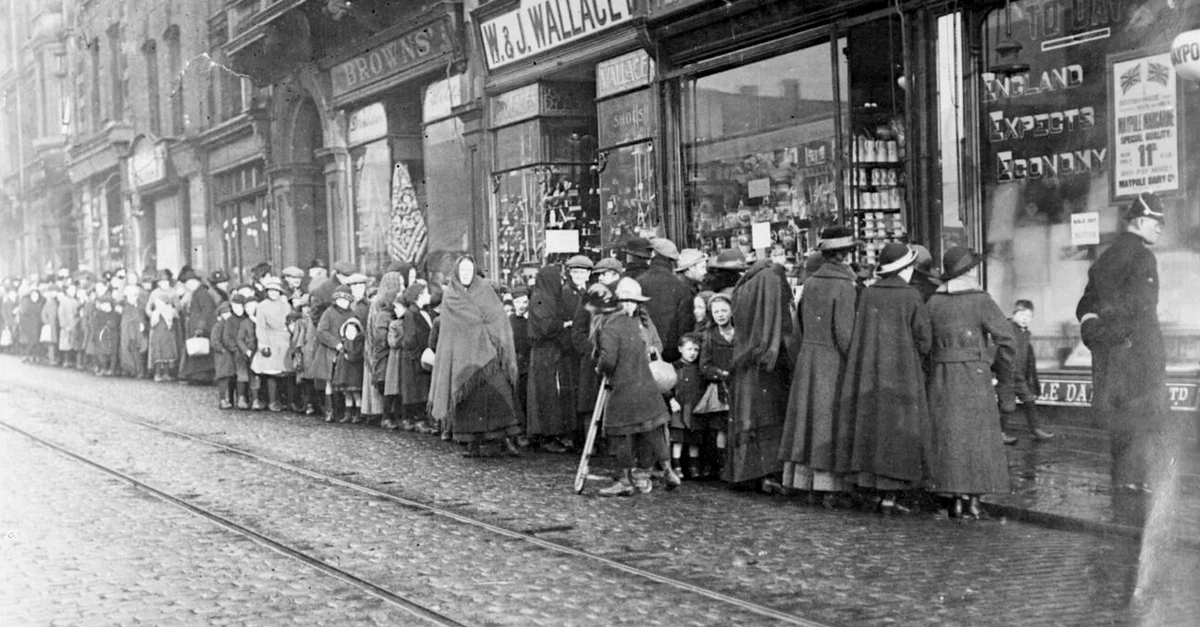 A photograph showing people queuing in Blackburn, England to buy food during the First World War (1914-18). Food shortages were common and led to rationing of certain staple items.