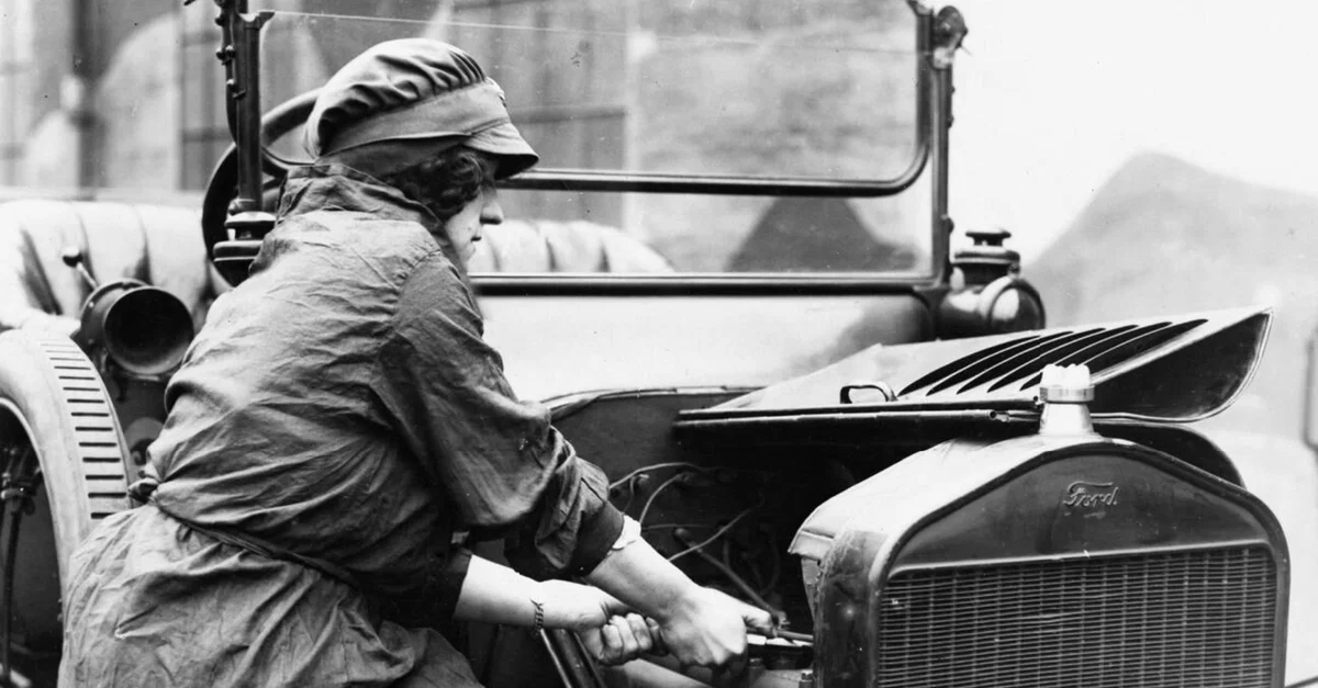 A 1918 photograph showing a woman mechanic in the British Women's Royal Air Force (WRAF) during the First World War (1914-18). The car is a Model-T Ford.